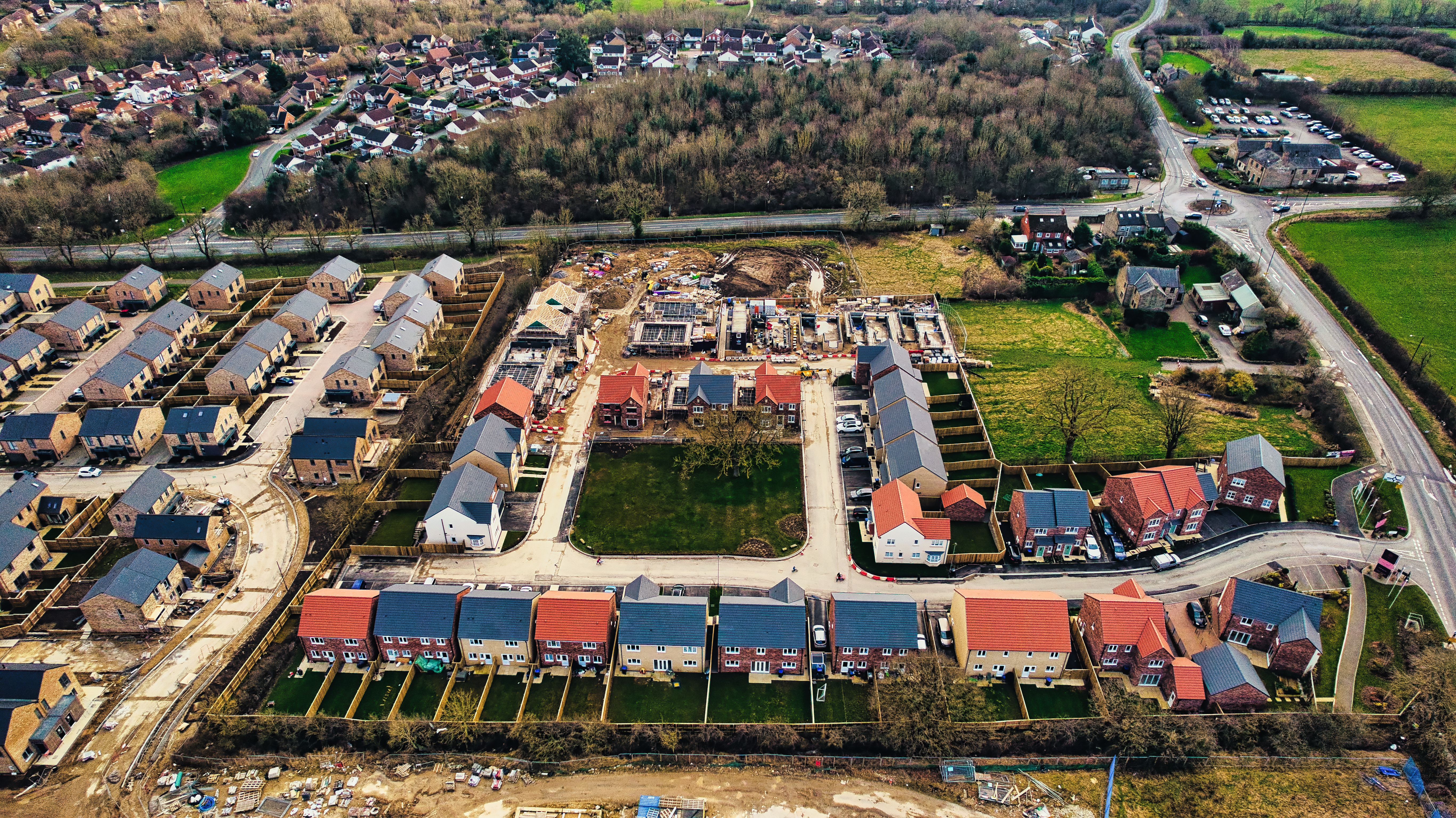 Aerial view of a residential development with partially constructed houses and roads, showcasing suburban expansion in Harrogate, North Yorkshire.