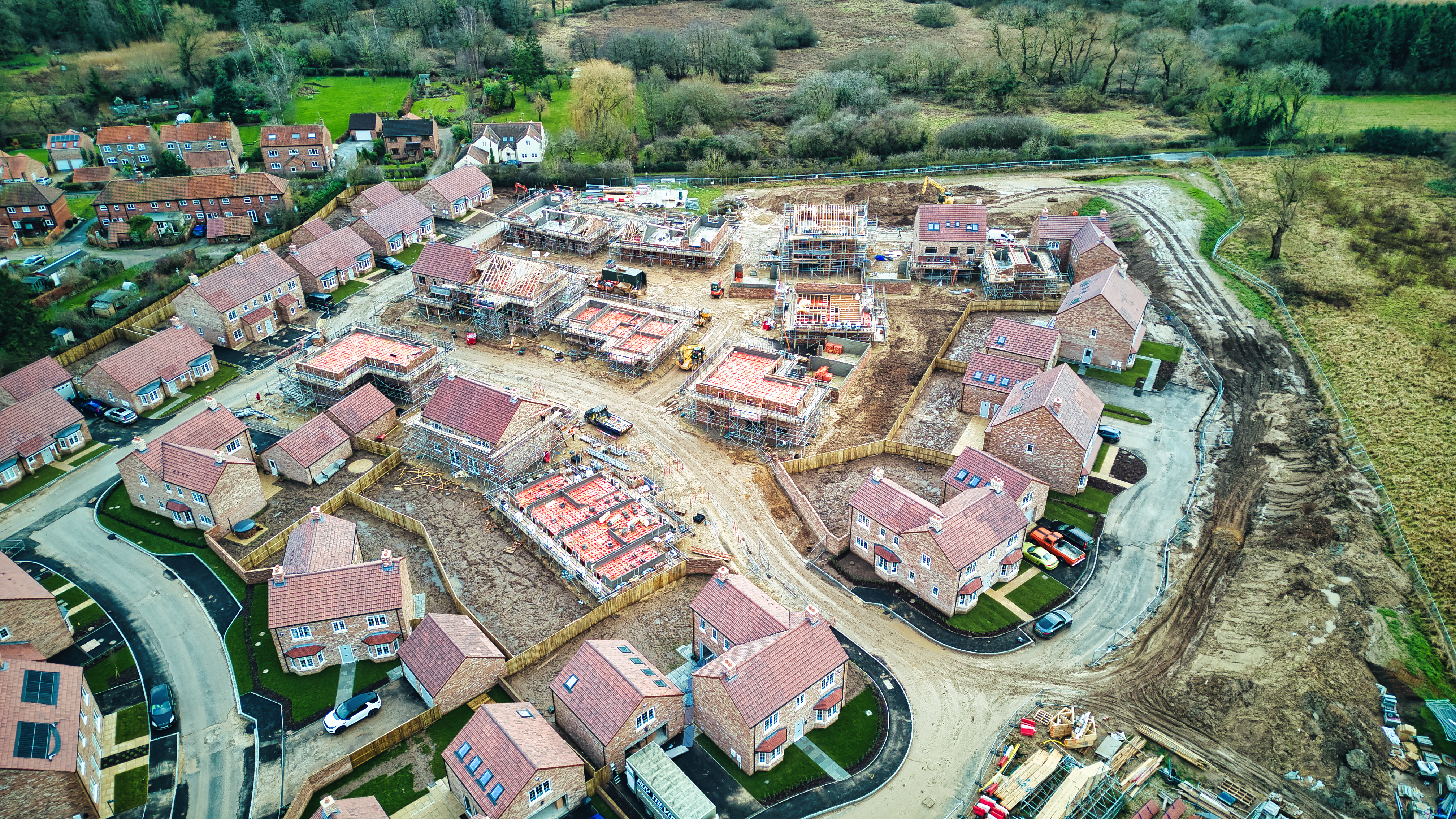 Aerial view of a residential housing development under construction with partially built homes and infrastructure.