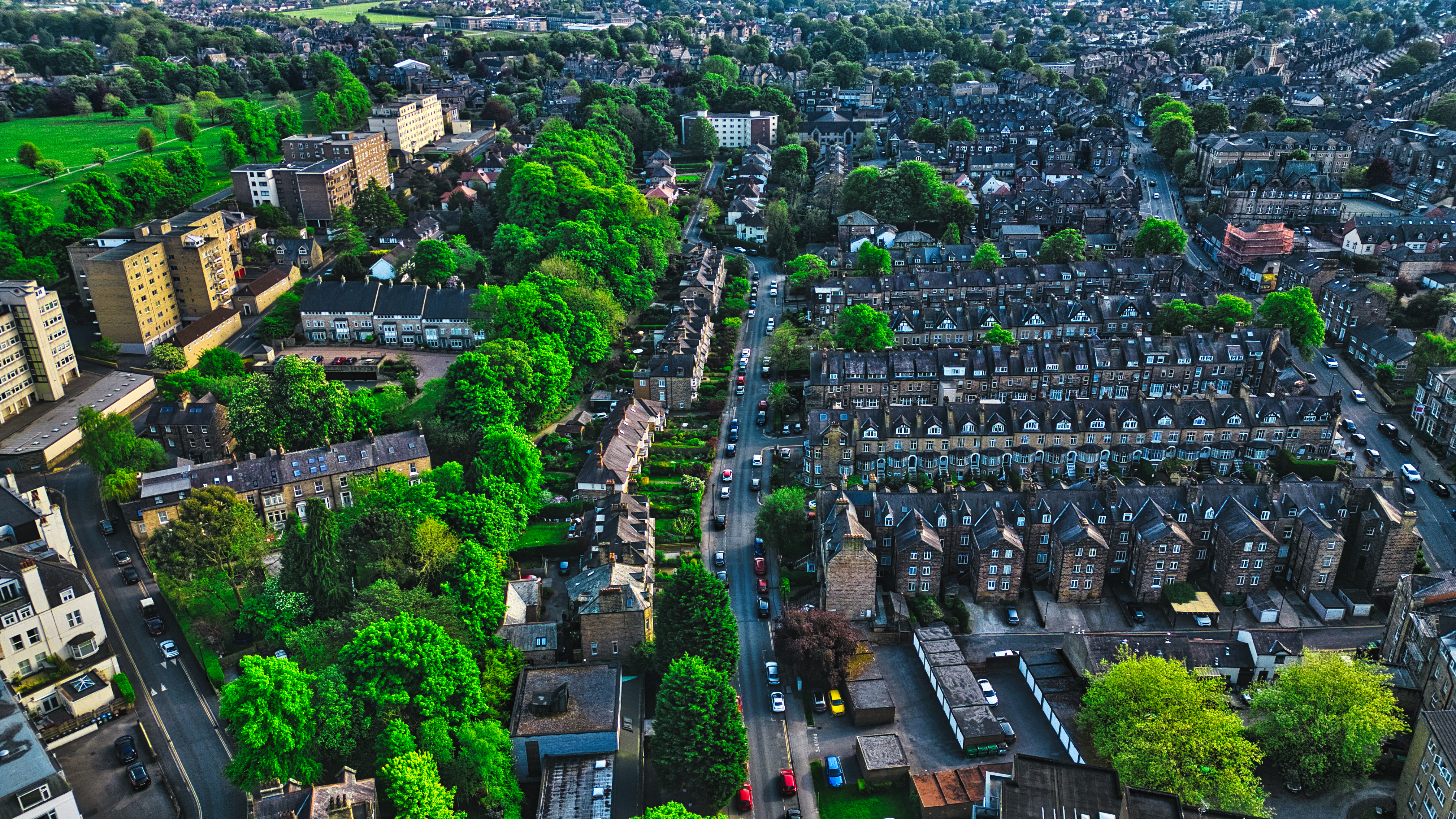 Aerial view of a residential neighborhood with rows of houses, green trees, and streets. The area is surrounded by greenery and has a mix of modern and traditional buildings.