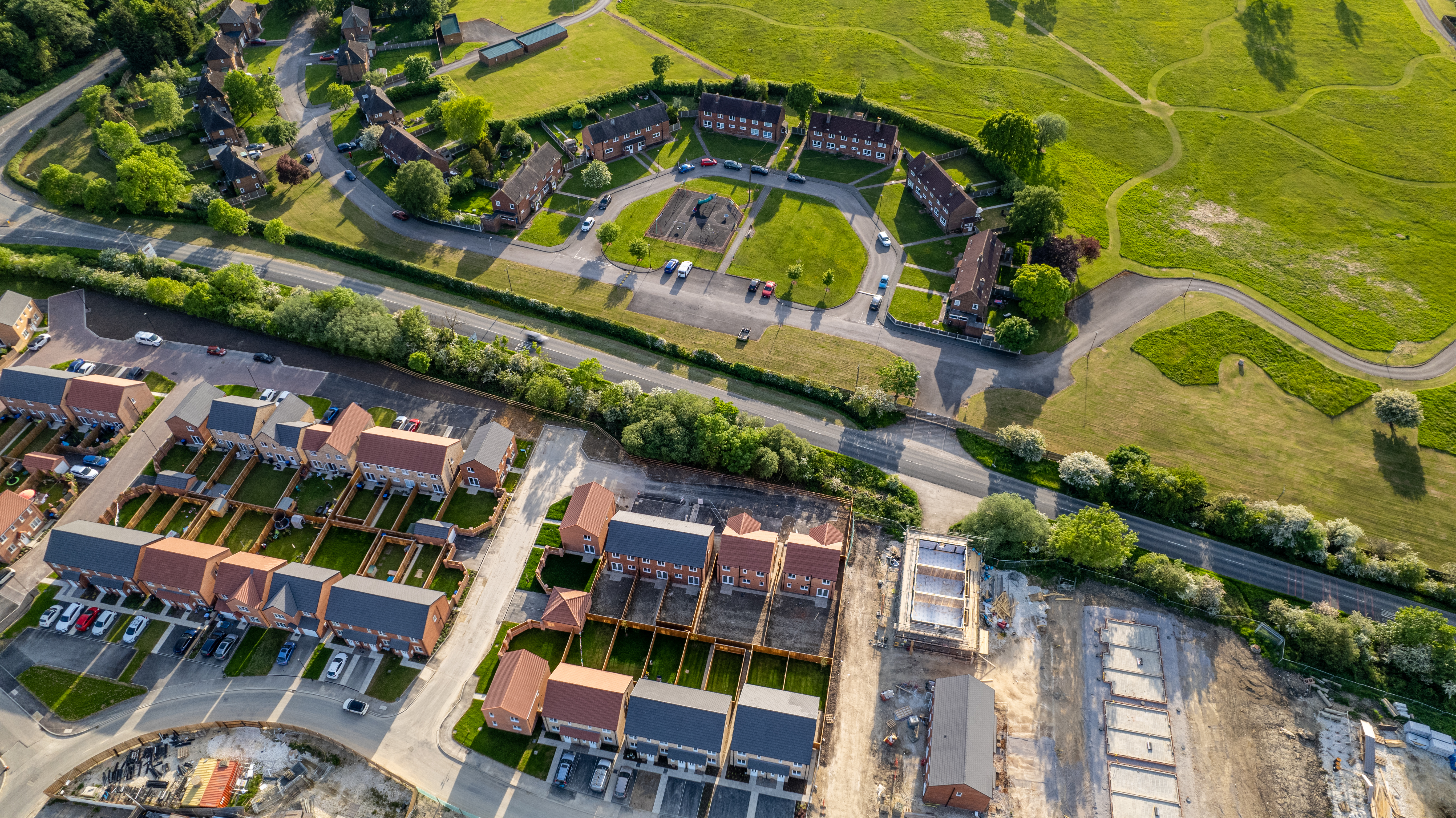 Aerial view of a residential neighborhood with houses, roads, and green spaces during the daytime.
