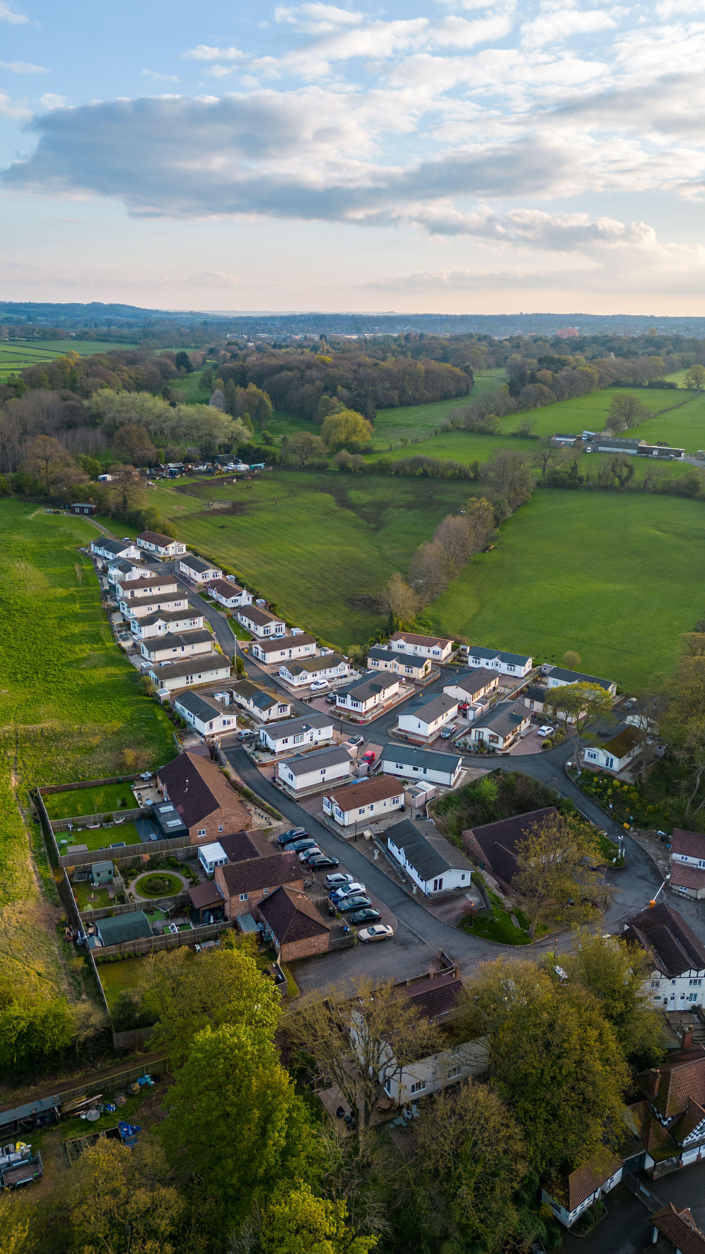 Aerial view of a residential street with houses lined up next to a lush green field under a clear sky at dusk in Knaresborough, North Yorkshire.