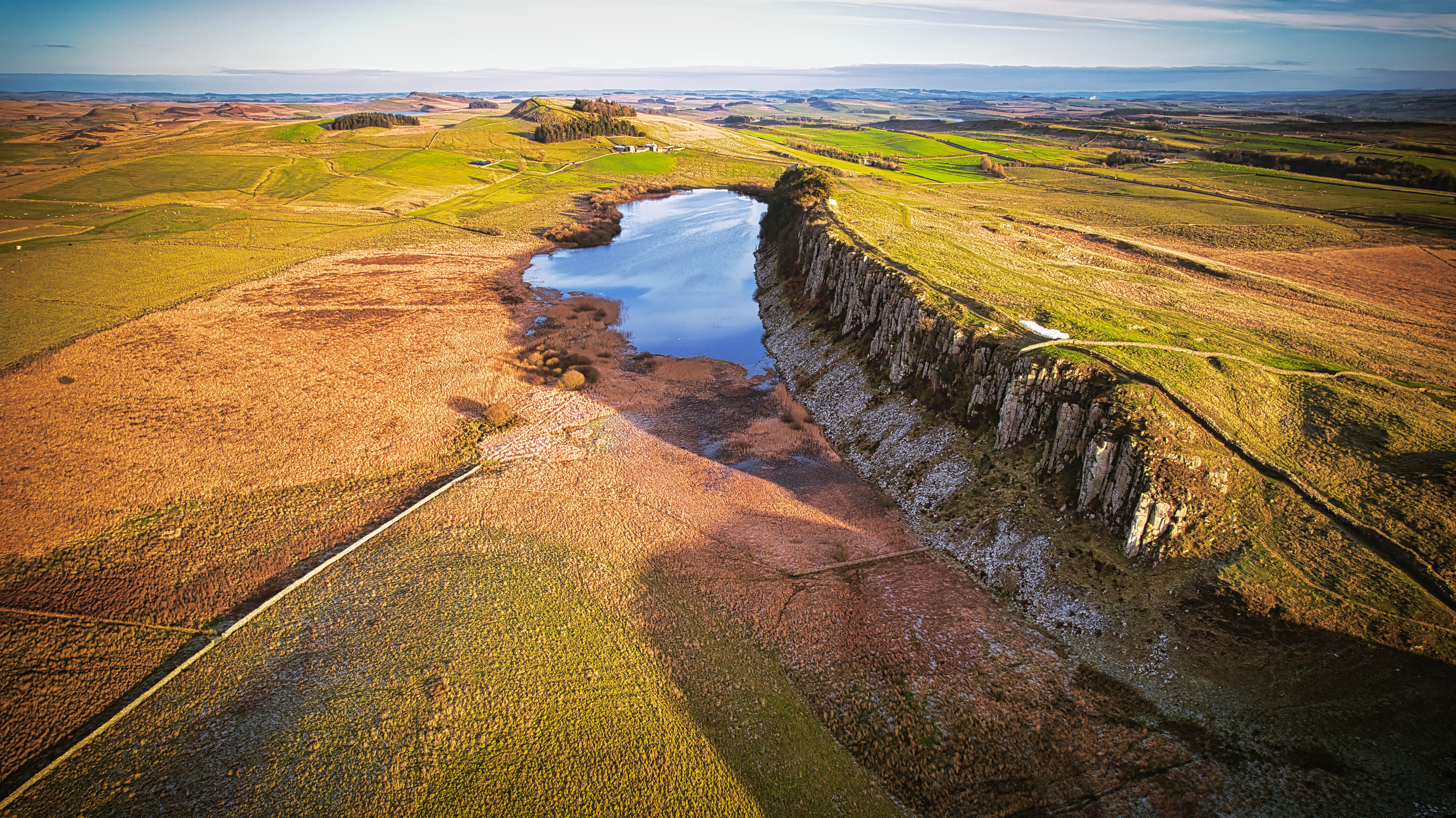 Aerial view of a rugged cliff with a pond, surrounded by vast open fields under a clear sky at Sycamore Gap, Northumberland, UK.