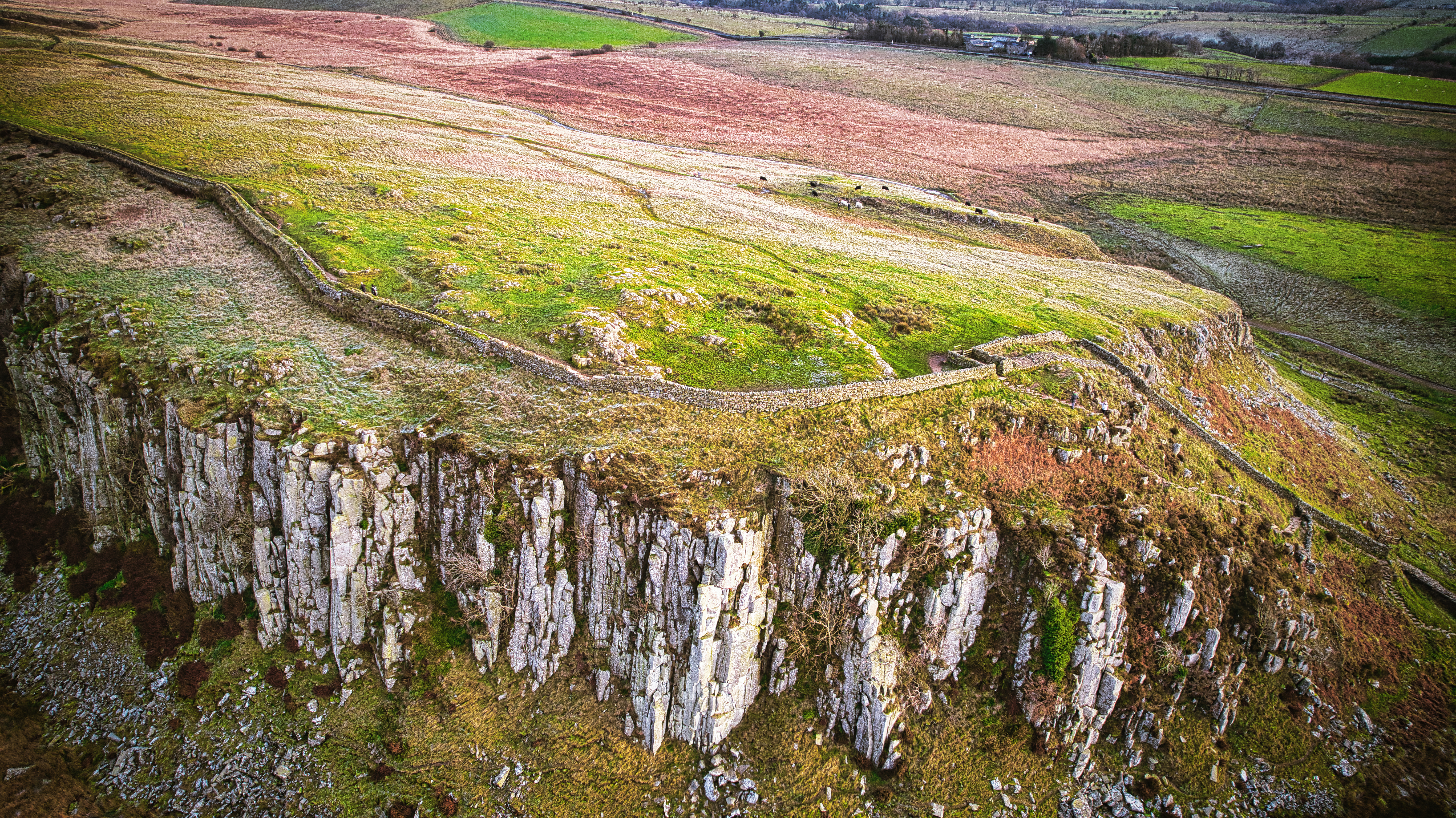 Aerial view of a rugged cliff with diverse vegetation and undulating fields in the countryside at Sycamore Gap, Northumberland, UK.
