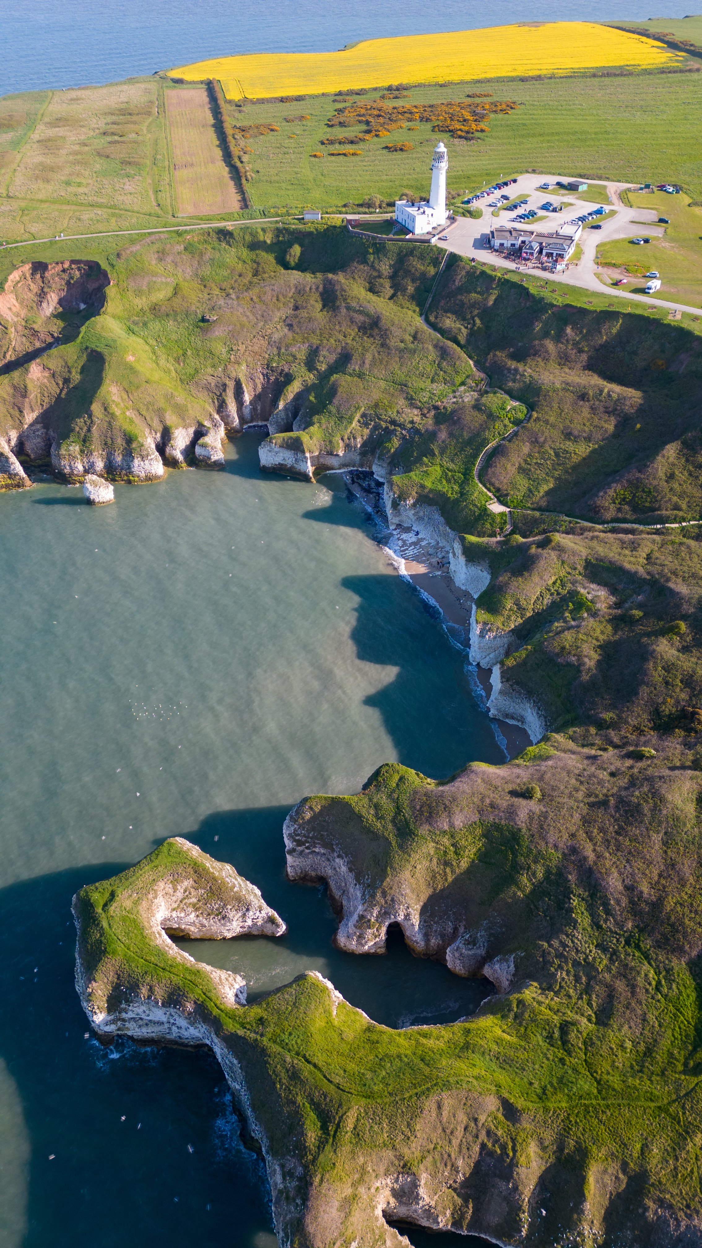 Aerial view of a rugged coastline with a lighthouse, blue sea, and green fields under a clear sky in Flamborough, England