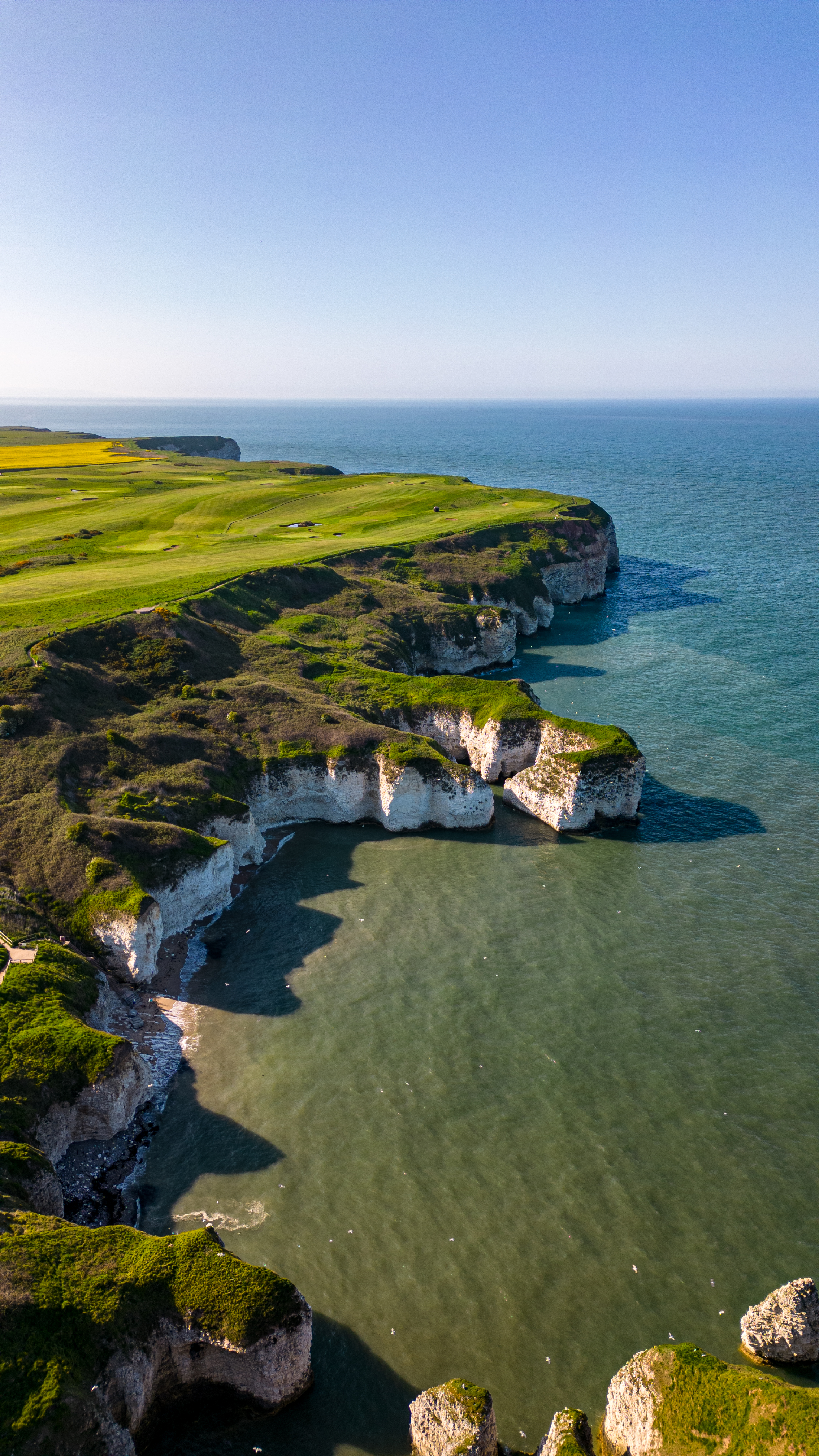 Aerial view of a rugged coastline with cliffs and a green golf course overlooking a serene blue sea in Flamborough, England