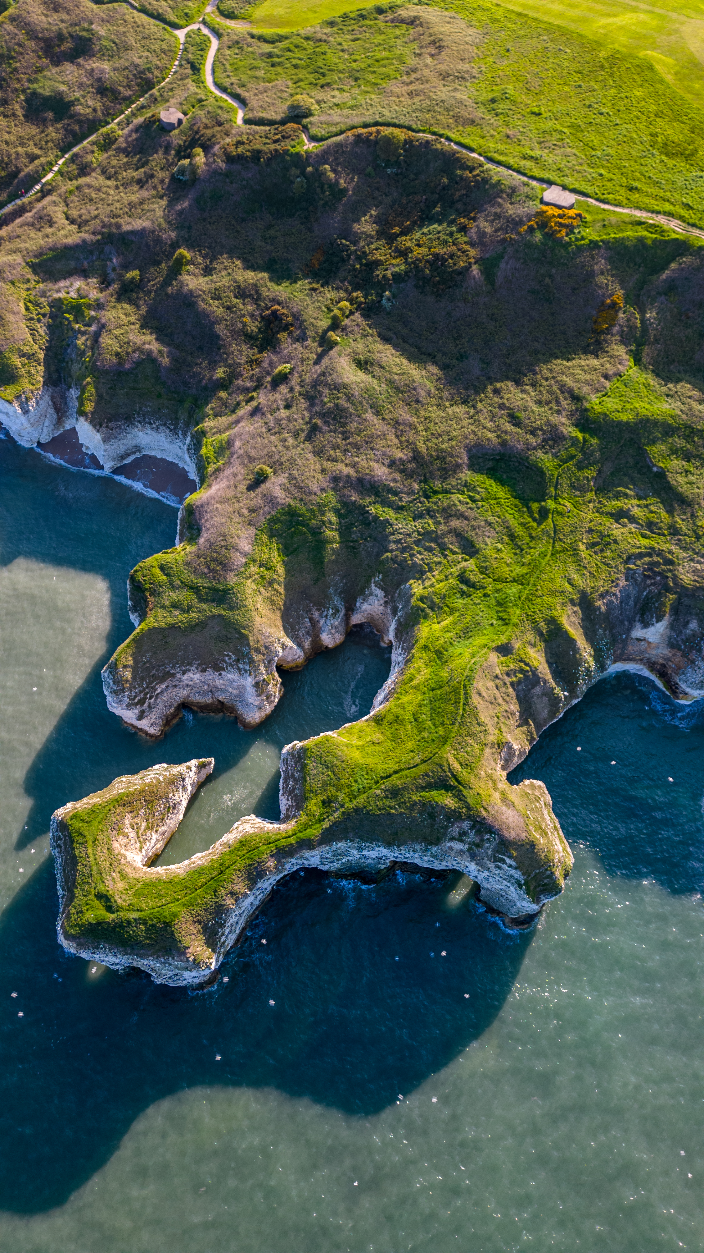 Aerial view of a rugged coastline with cliffs and greenery meeting the sea in Flamborough, England