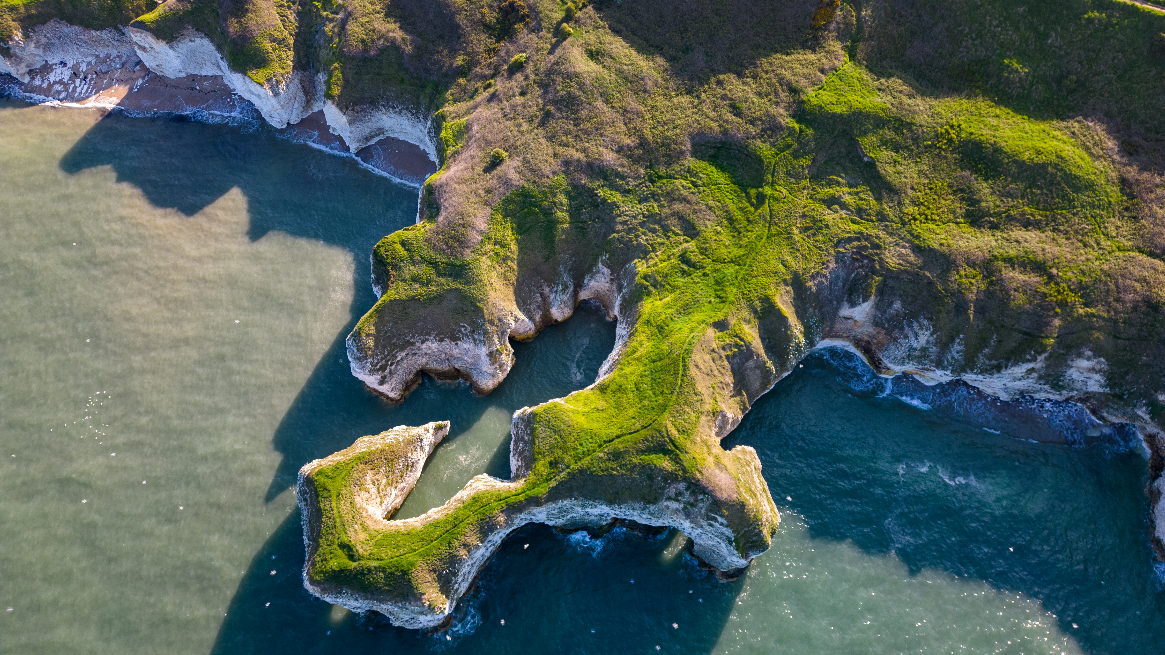 Aerial view of a rugged coastline with green cliffs and blue sea in Flamborough, England