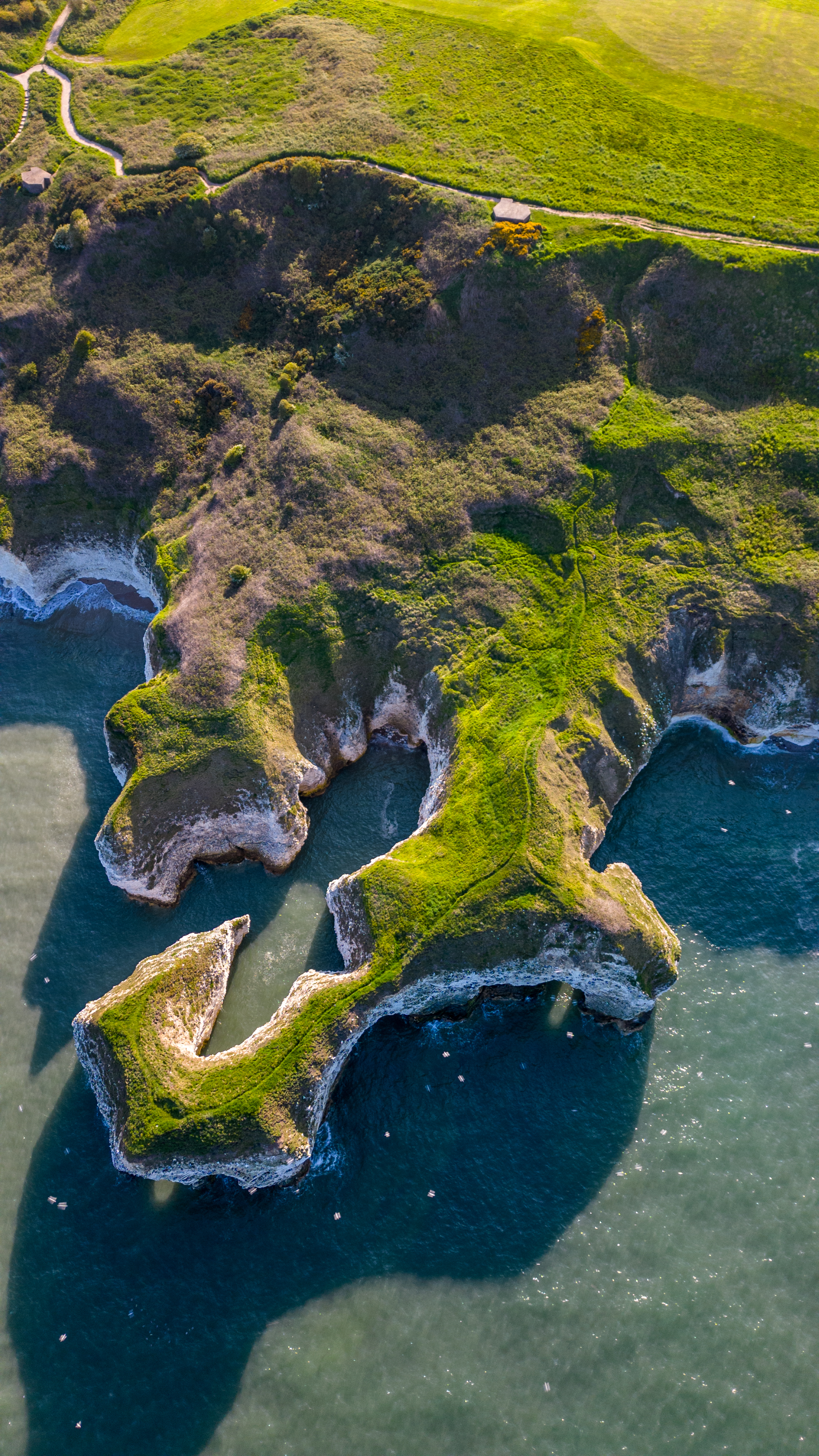 Aerial view of a rugged coastline with green cliffs and blue sea in Flamborough, England