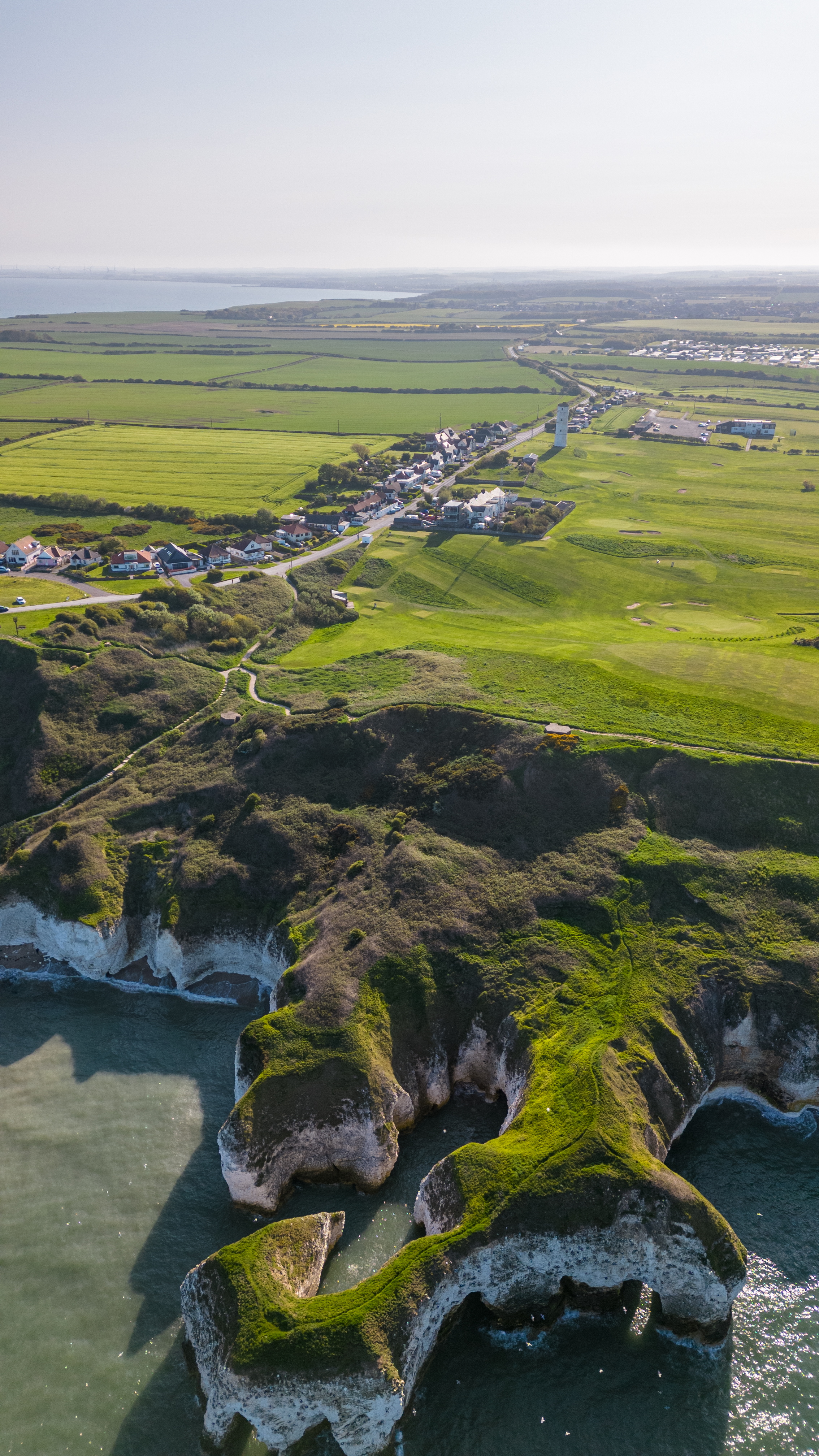 Aerial view of a rugged coastline with green fields and cliffs overlooking a calm sea in Flamborough, England