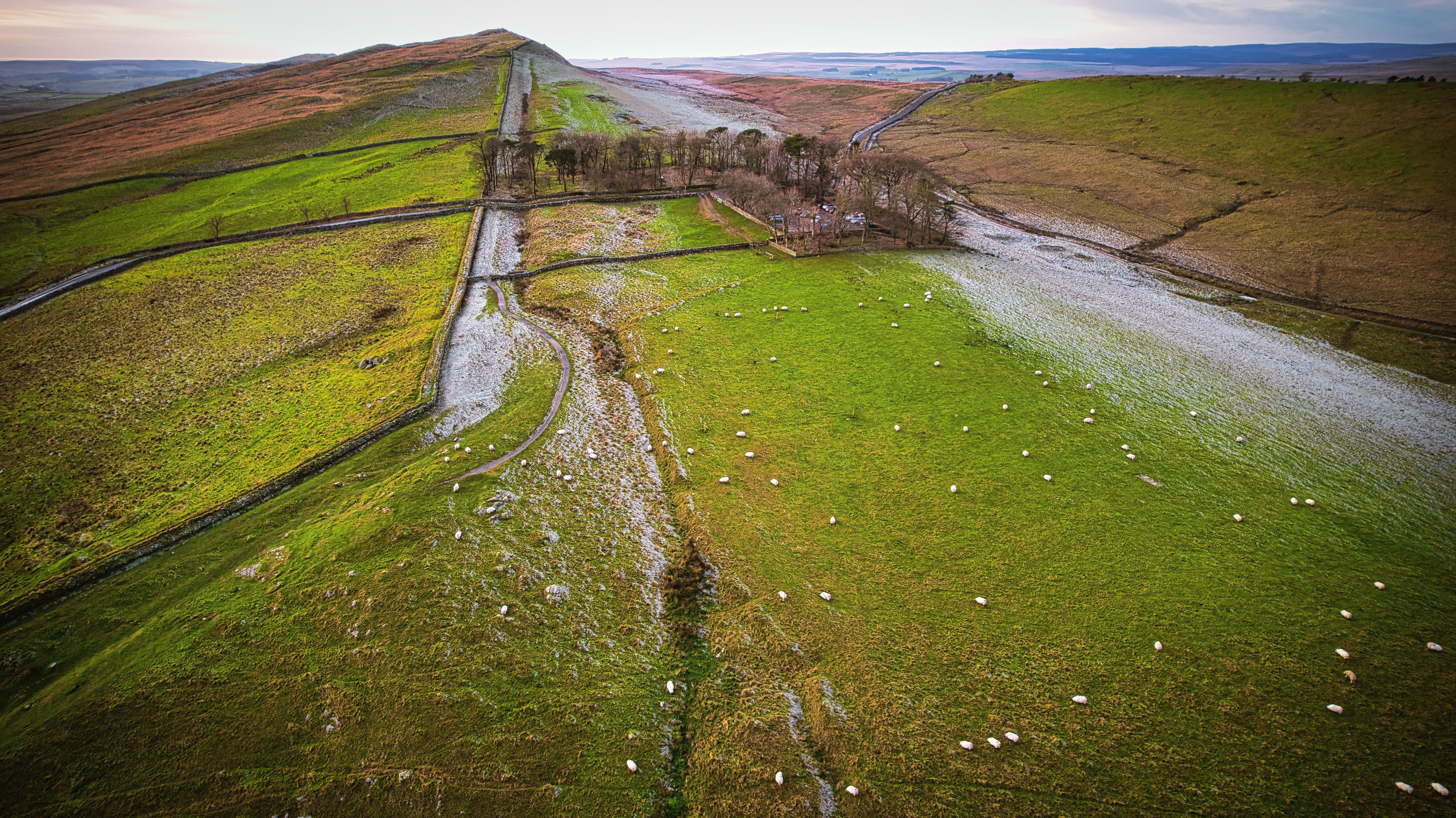 Aerial view of a rural landscape with a winding road, green fields, and stone walls at dusk at Sycamore Gap, Northumberland, UK.