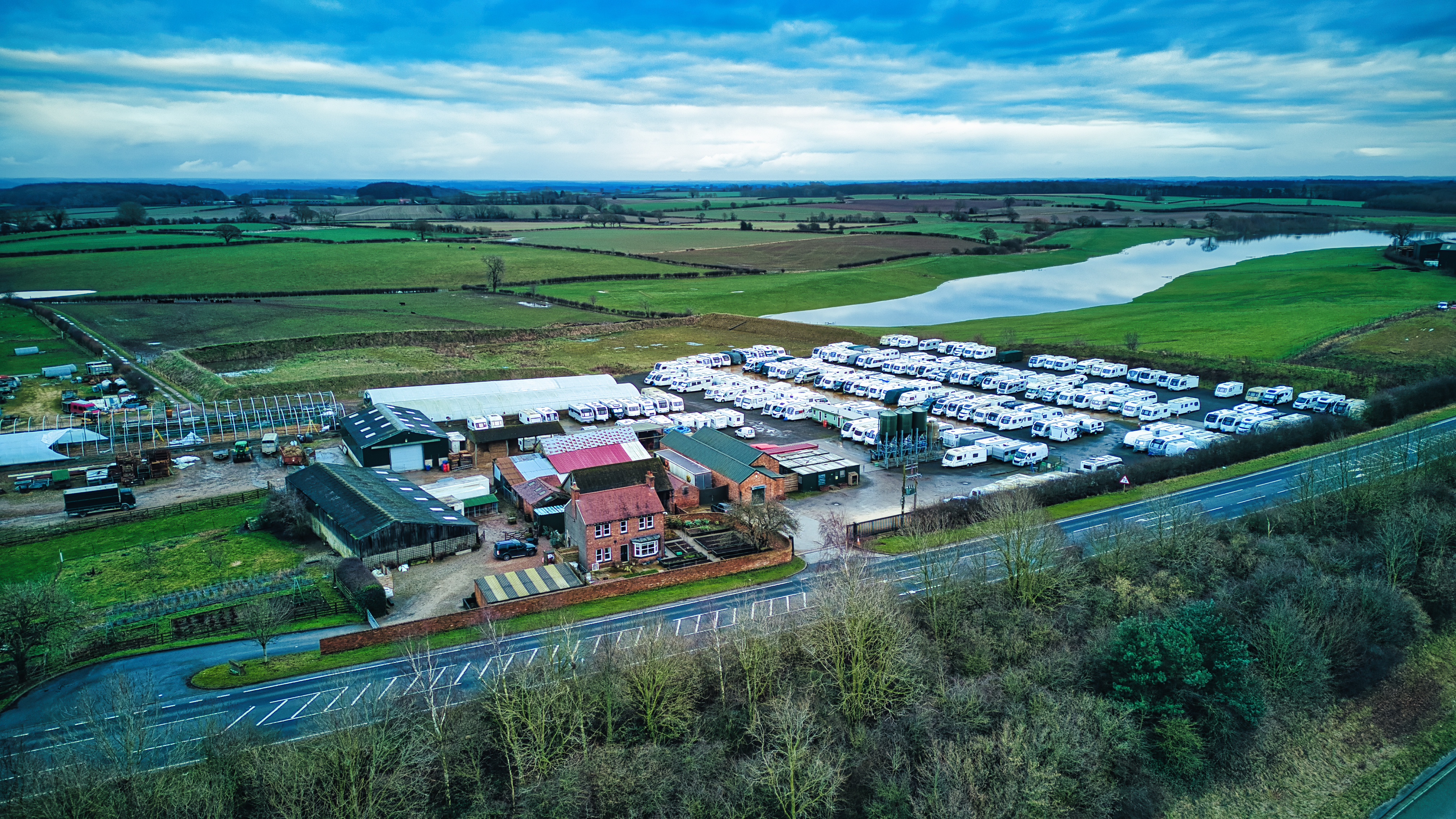 Aerial view of a rural landscape with farm buildings, green fields, and a parking lot with vehicles.
