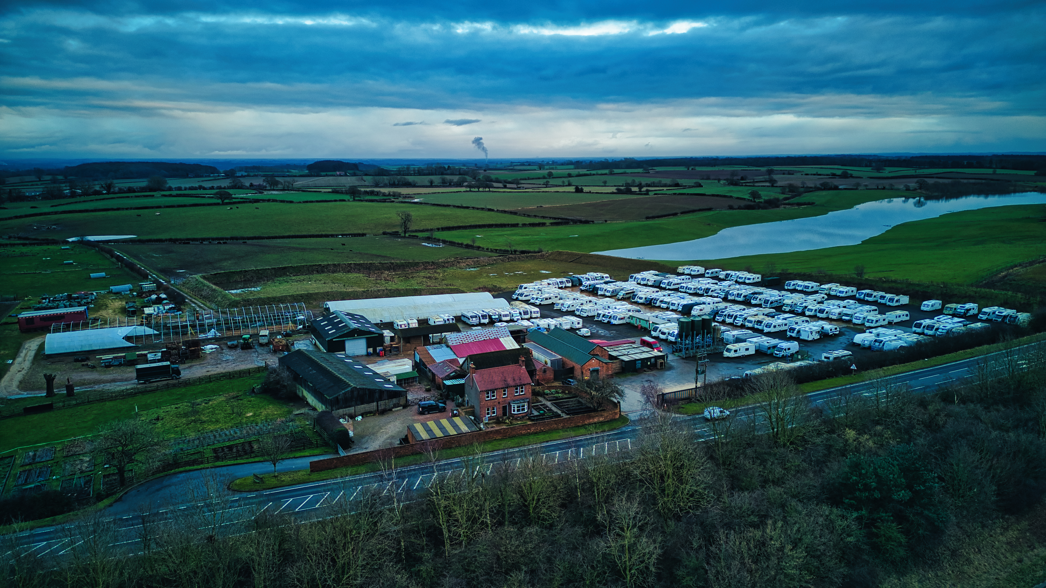 Aerial view of a rural landscape with farmland, a river, and clustered buildings under a cloudy sky at dusk.