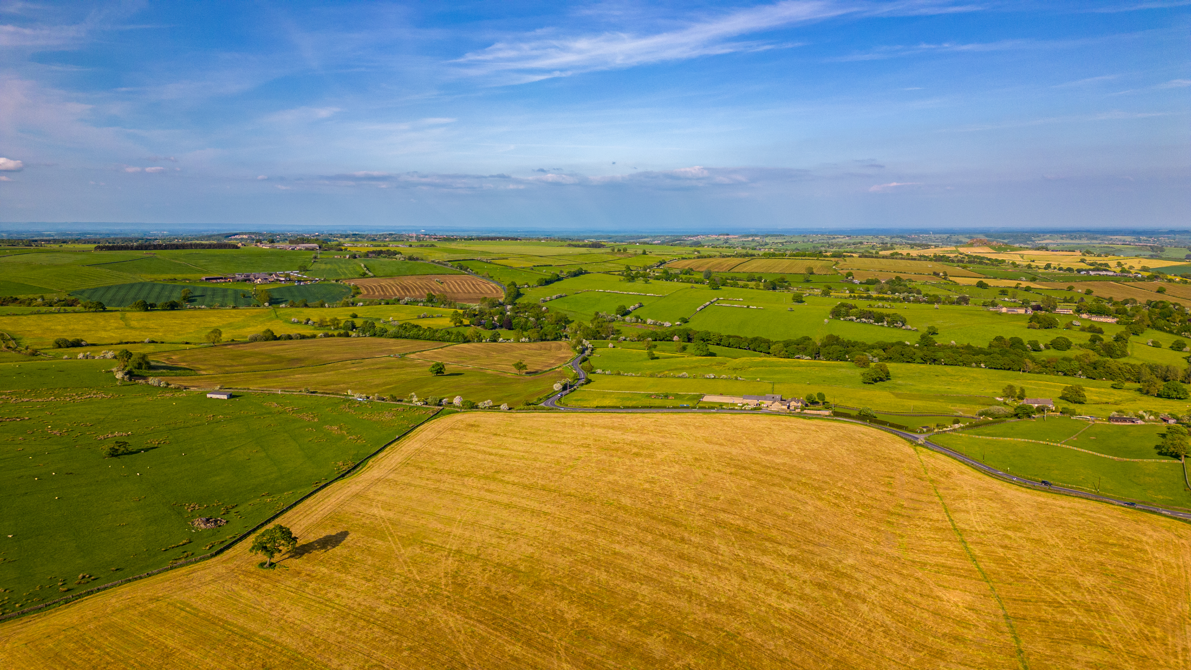 Aerial view of a rural landscape with golden fields, green pastures, and a clear horizon under a blue sky.