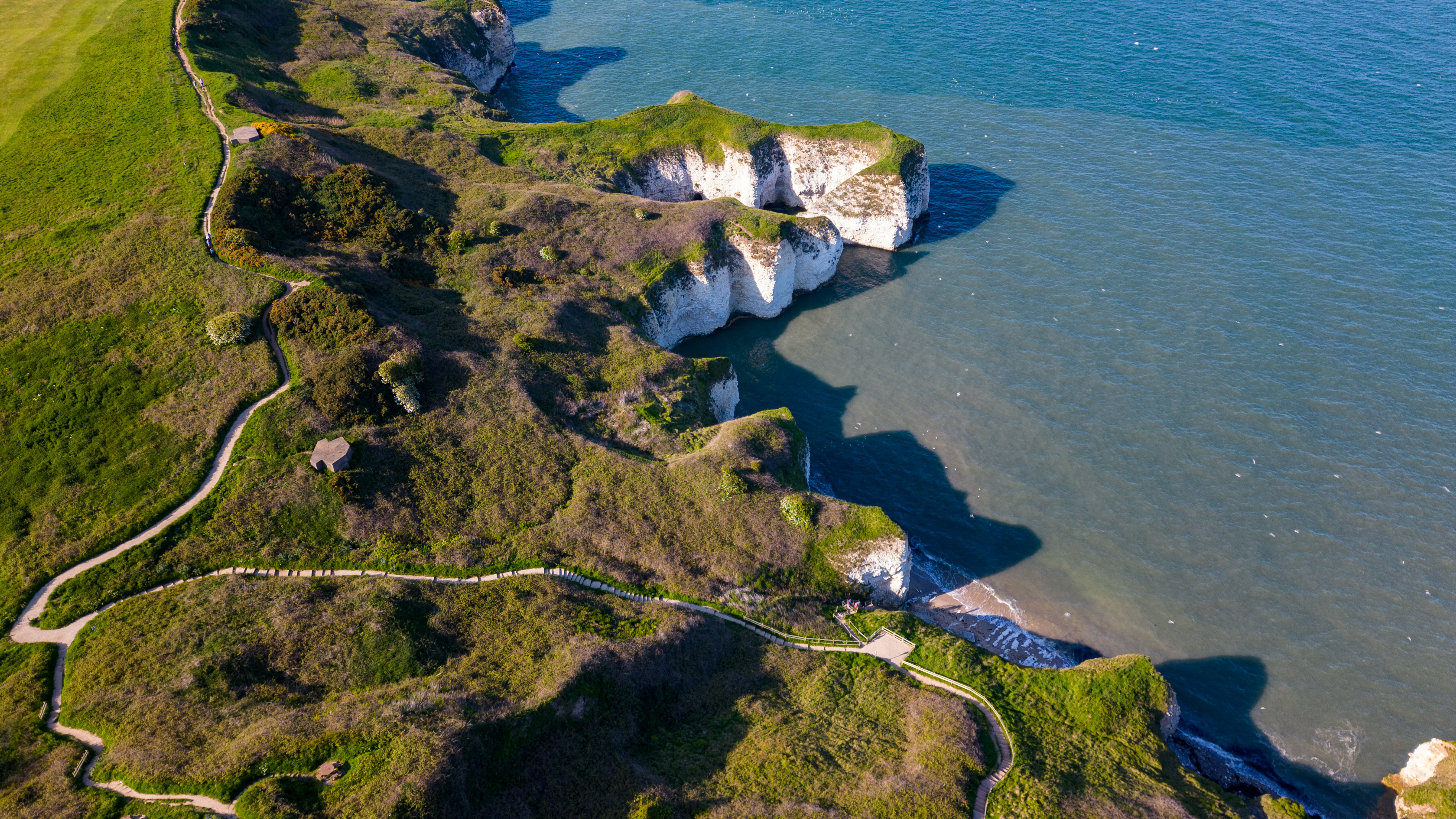 Aerial view of a scenic coastal cliff with greenery and winding paths leading to the beach in Flamborough, England