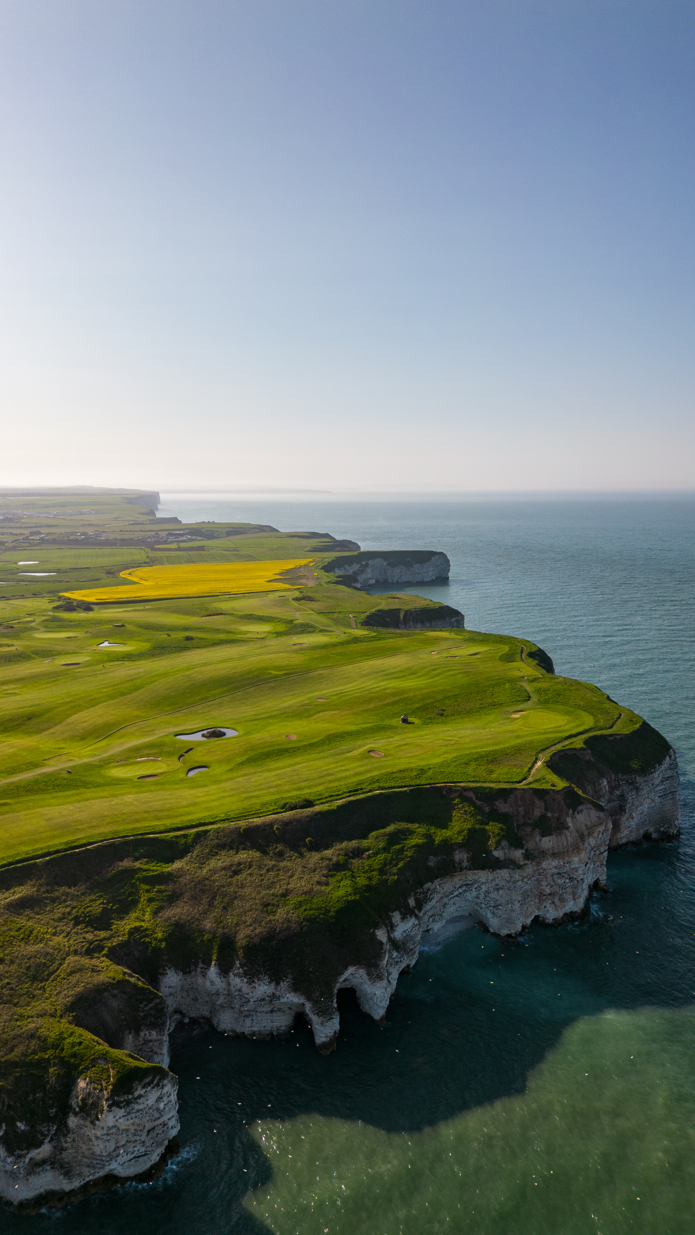 Aerial view of a scenic coastal golf course with lush green fairways and rugged cliffs overlooking a calm blue sea in Flamborough, England