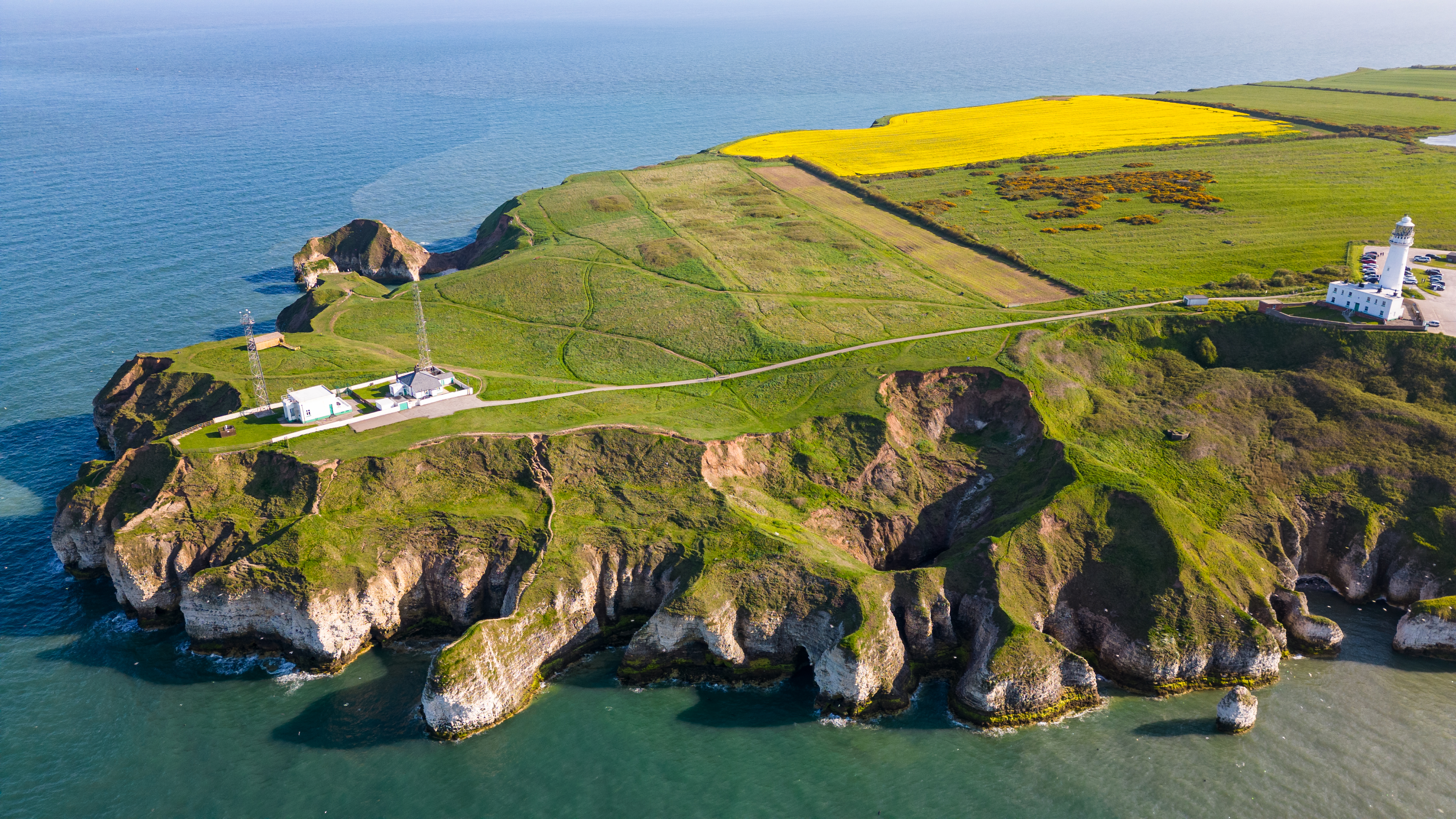 Aerial view of a scenic coastal landscape with cliffs, a lighthouse, and a blooming yellow field in Flamborough, England