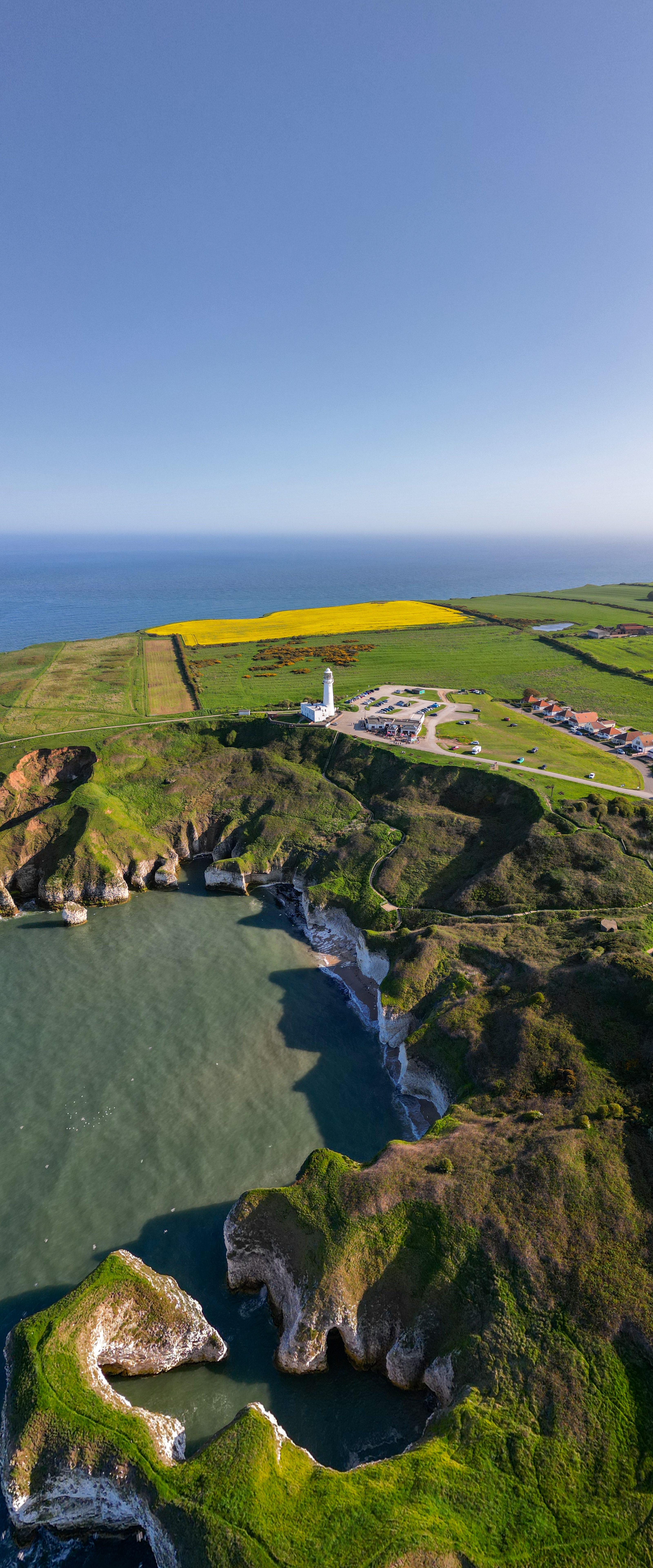 Aerial view of a scenic coastline with a lighthouse, vibrant fields, and cliffs overlooking a calm blue sea in Flamborough, England