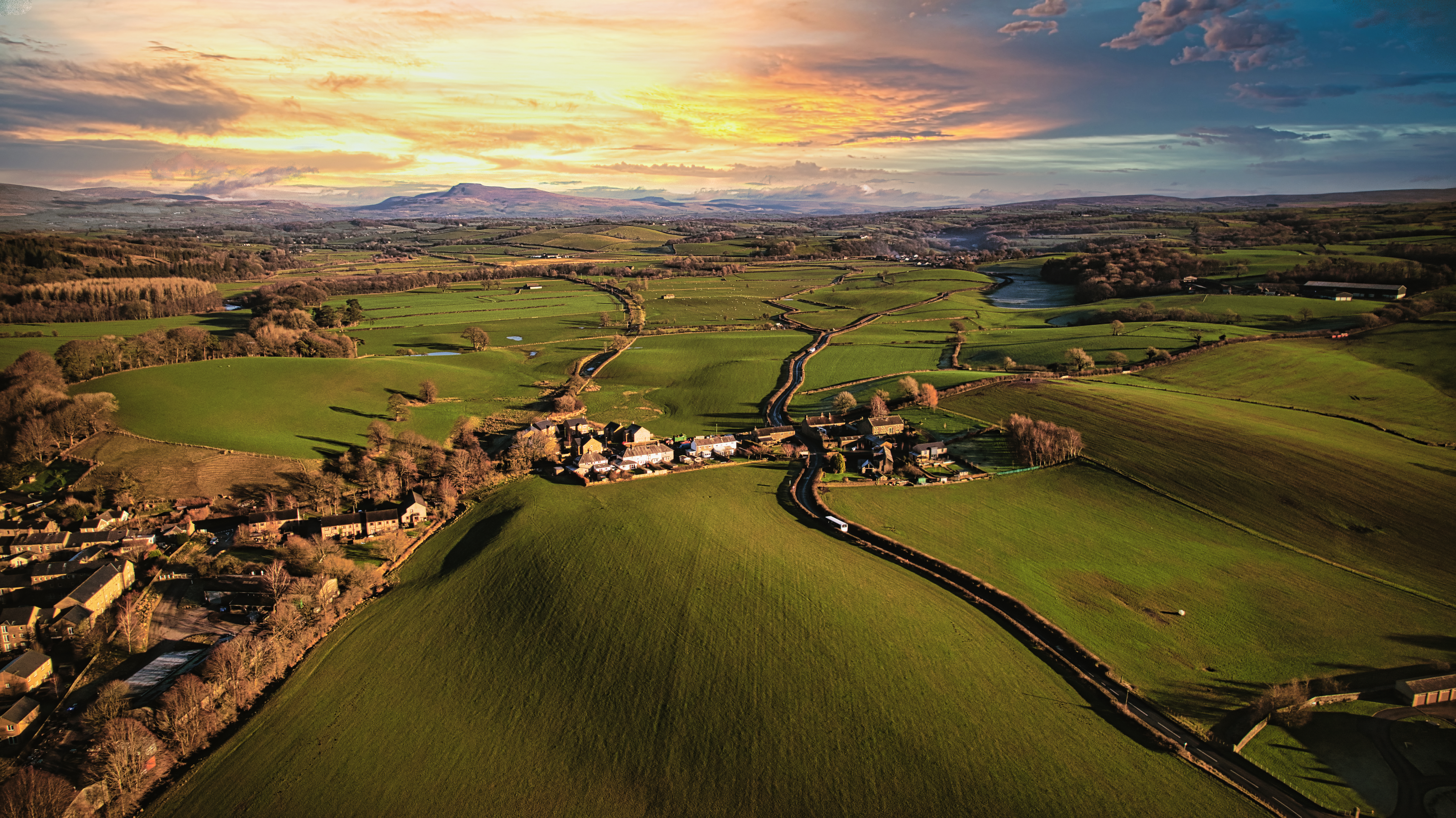 Aerial view of a scenic countryside at sunset with lush green fields, a small village, and a winding road leading towards distant hills.