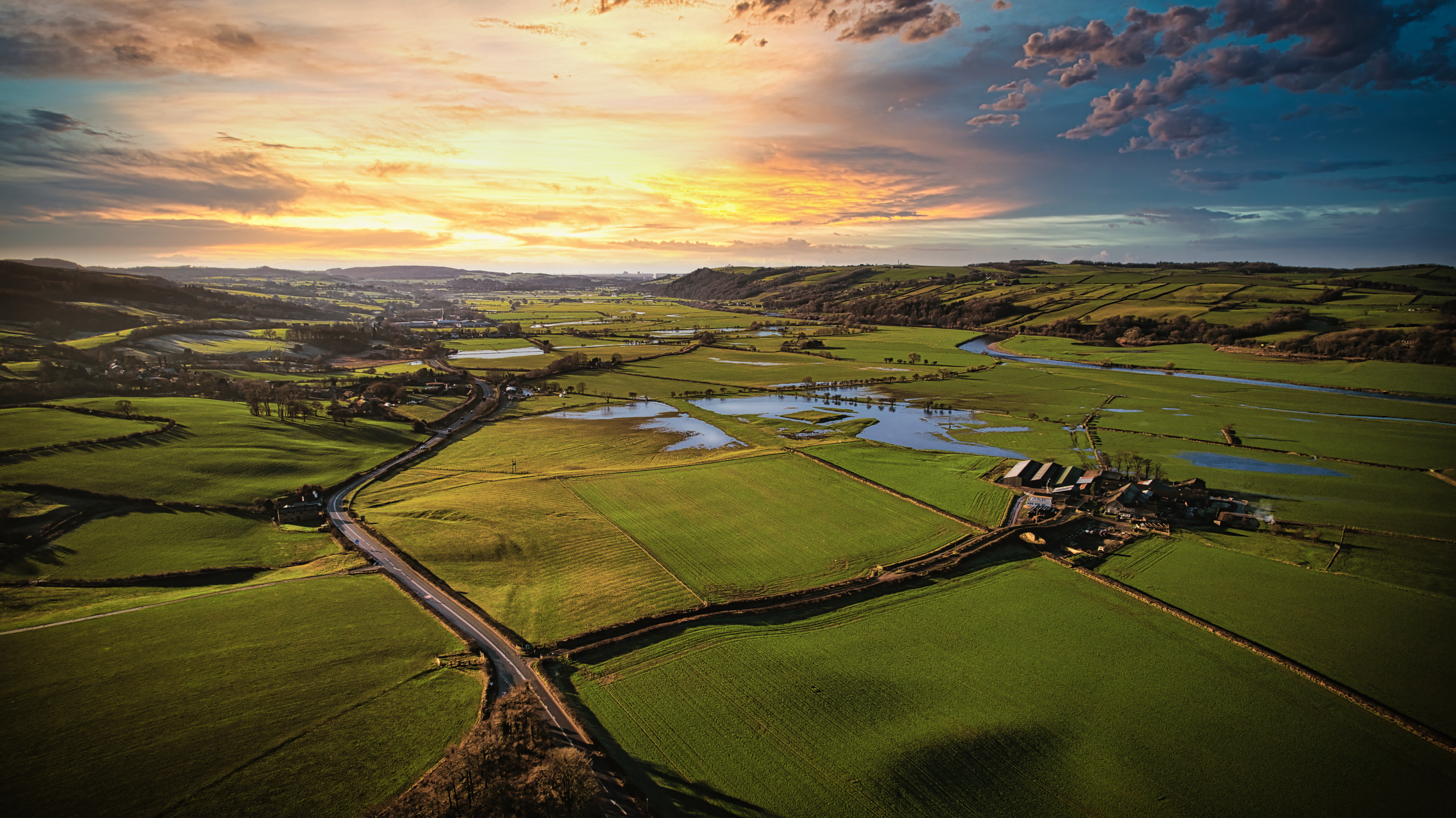 Aerial view of a scenic countryside at sunset with vibrant skies, lush green fields, and a winding road leading to a farmhouse.