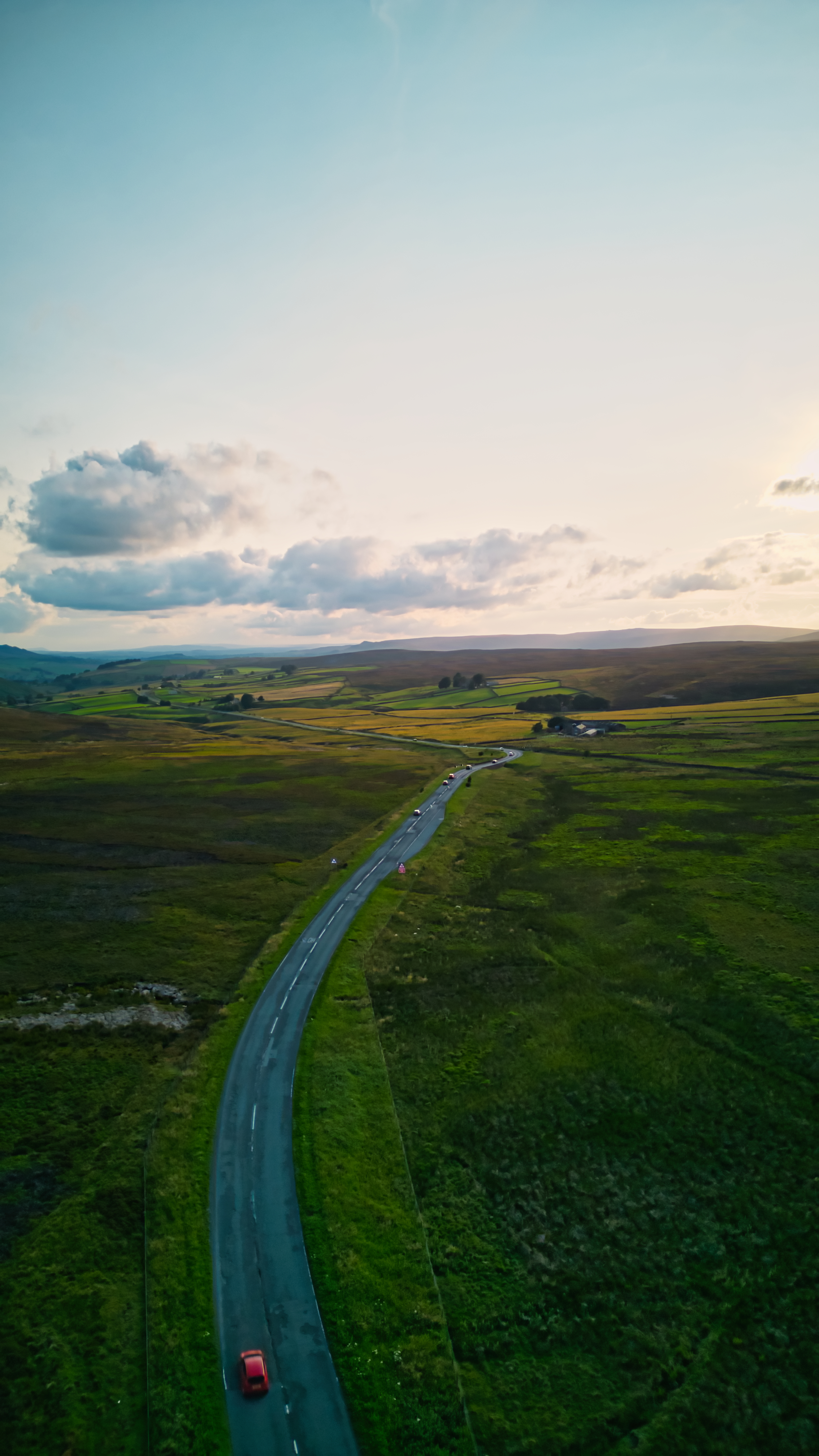 Aerial view of a scenic road winding through a lush green landscape with a single red car, under a vast sky at dusk in Yorkshire.