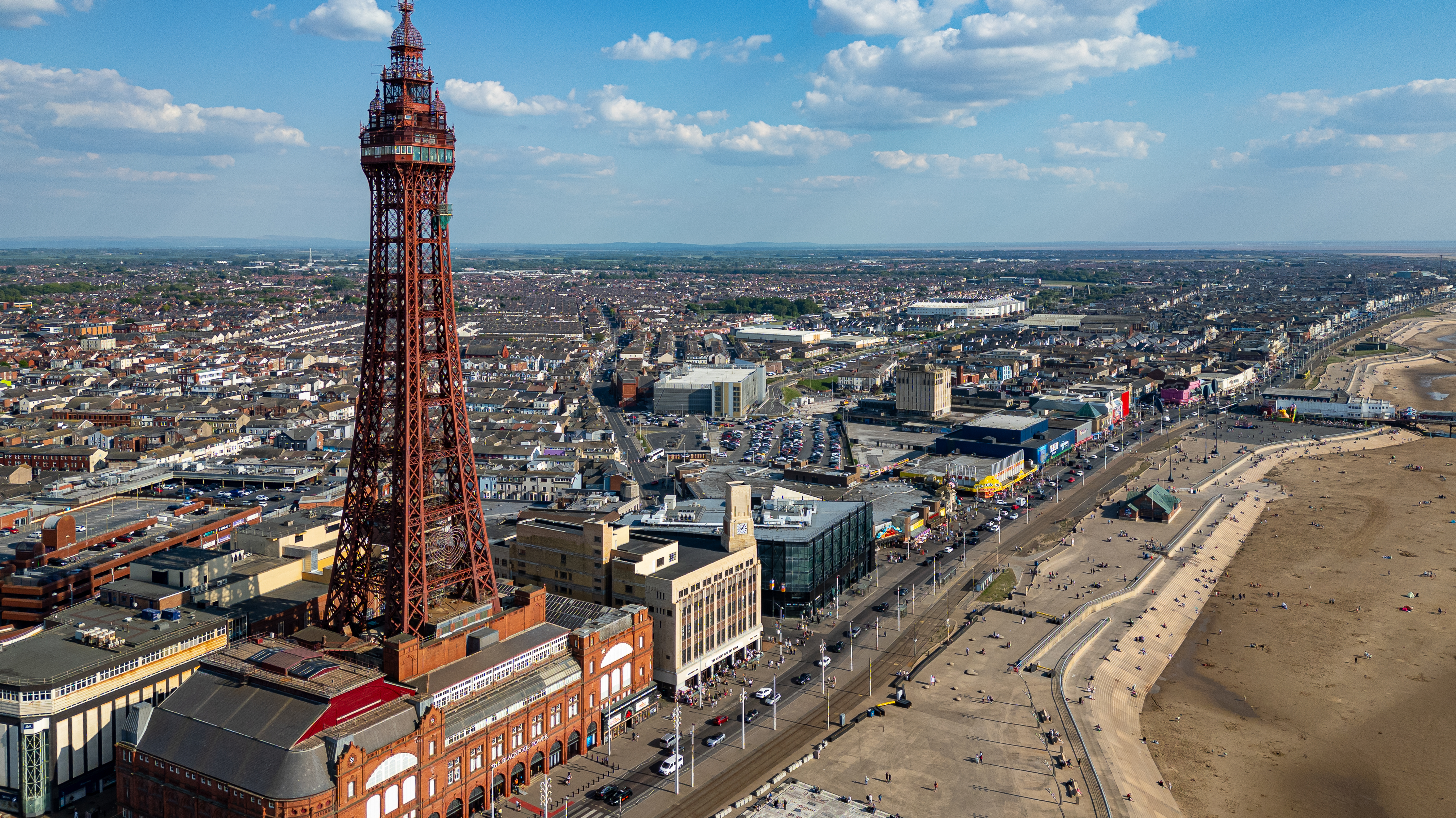 Aerial view of a seaside town with a prominent red iron tower, a wide promenade, a beach, and densely packed buildings in Blackpool, UK.