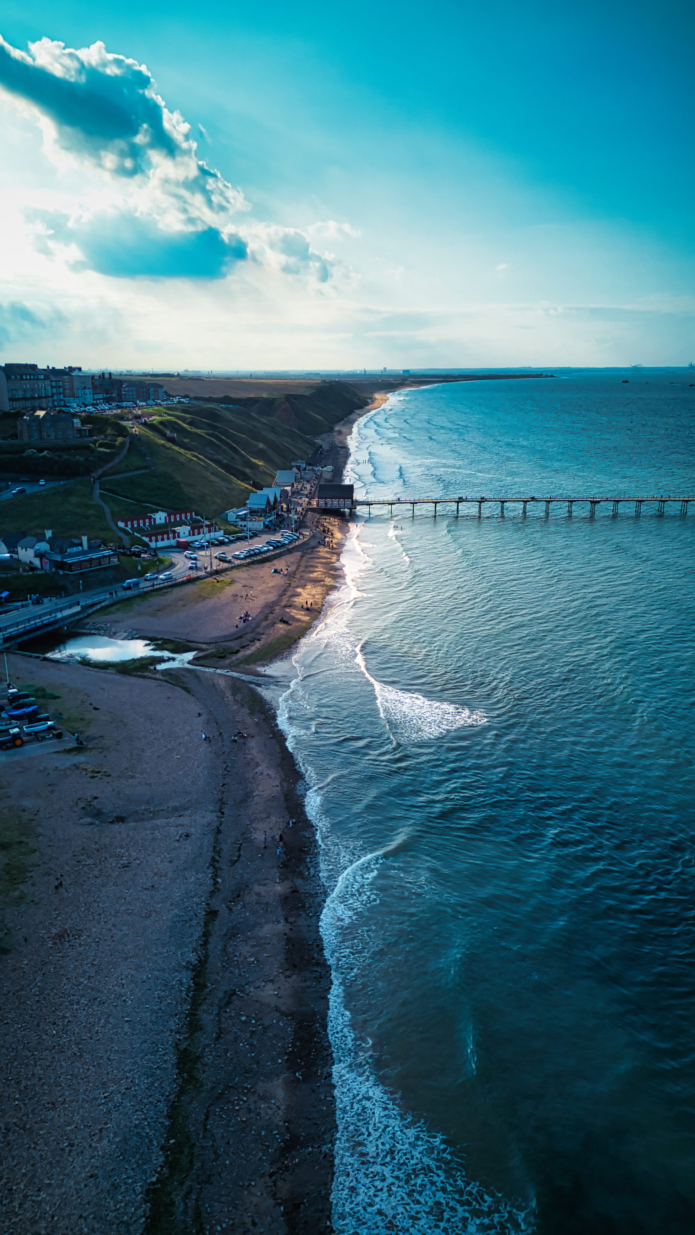 Aerial view of a serene beach with a pier extending into the sea, waves gently lapping the shore, under a blue sky with fluffy clouds in Saltburn-by-the-Sea