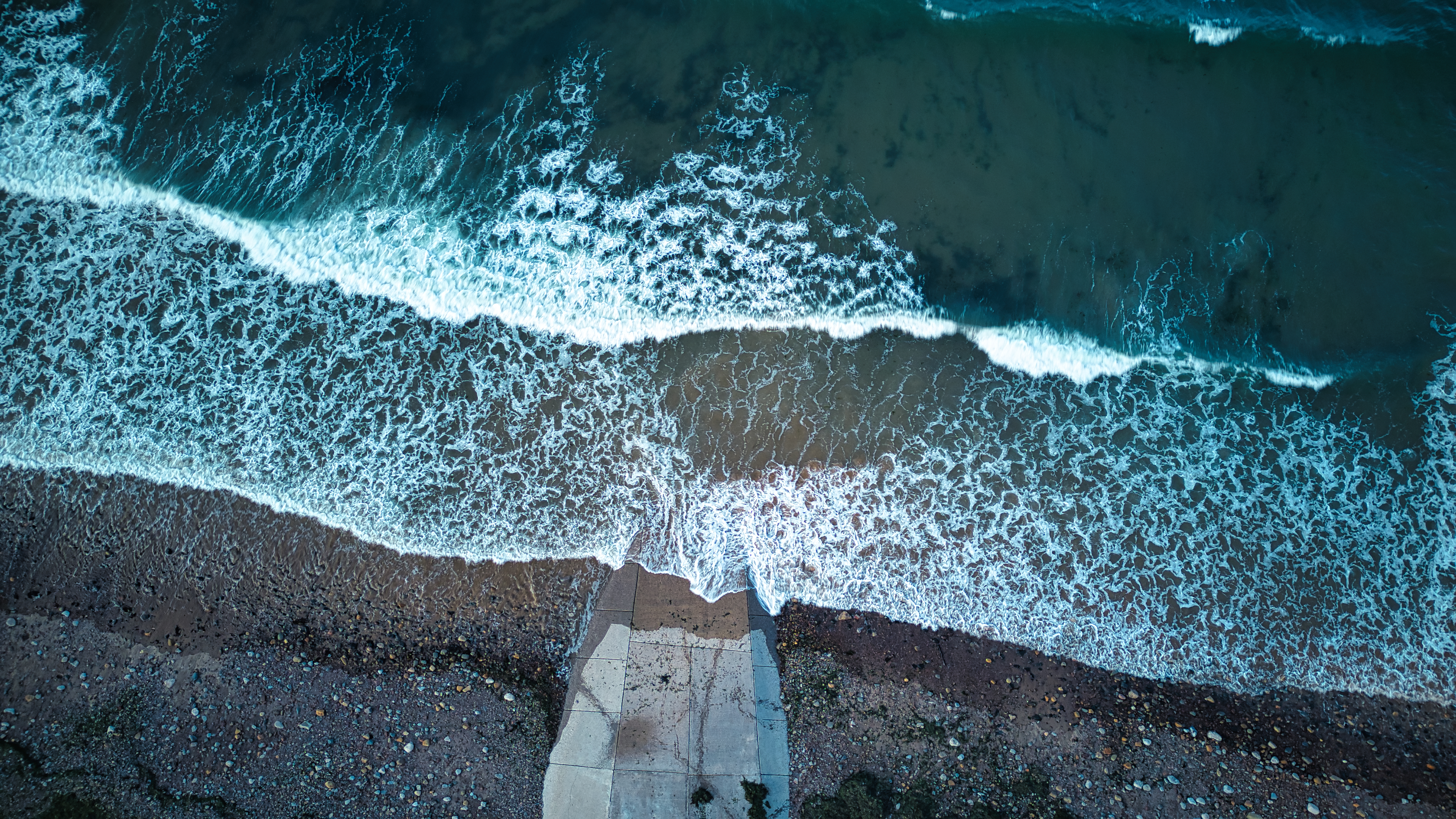 Aerial view of a serene beach with gentle waves lapping the shore at twilight in Saltburn-by-the-Sea