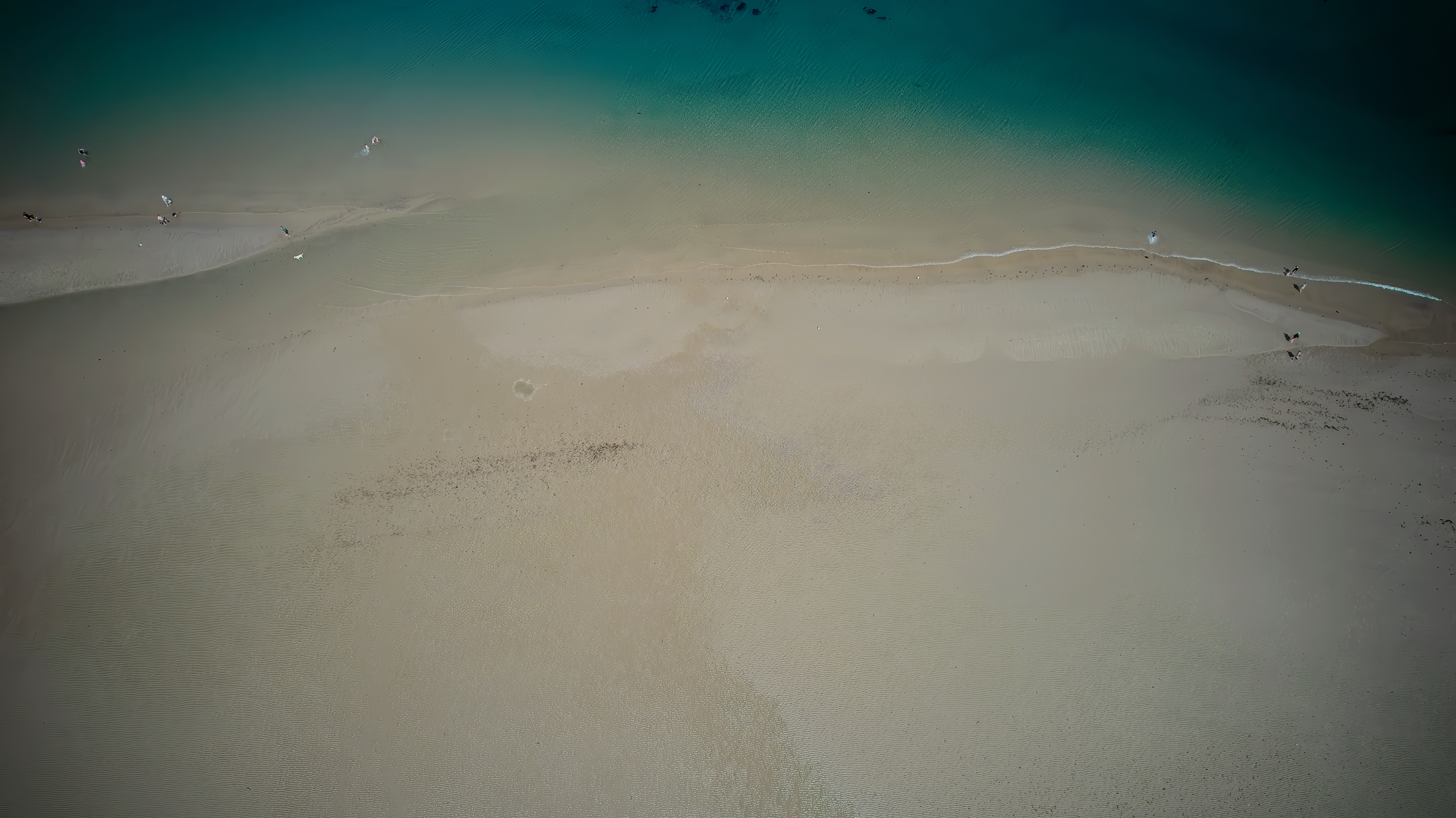 Aerial view of a serene beach with clear turquoise water and a few people walking along the shore.