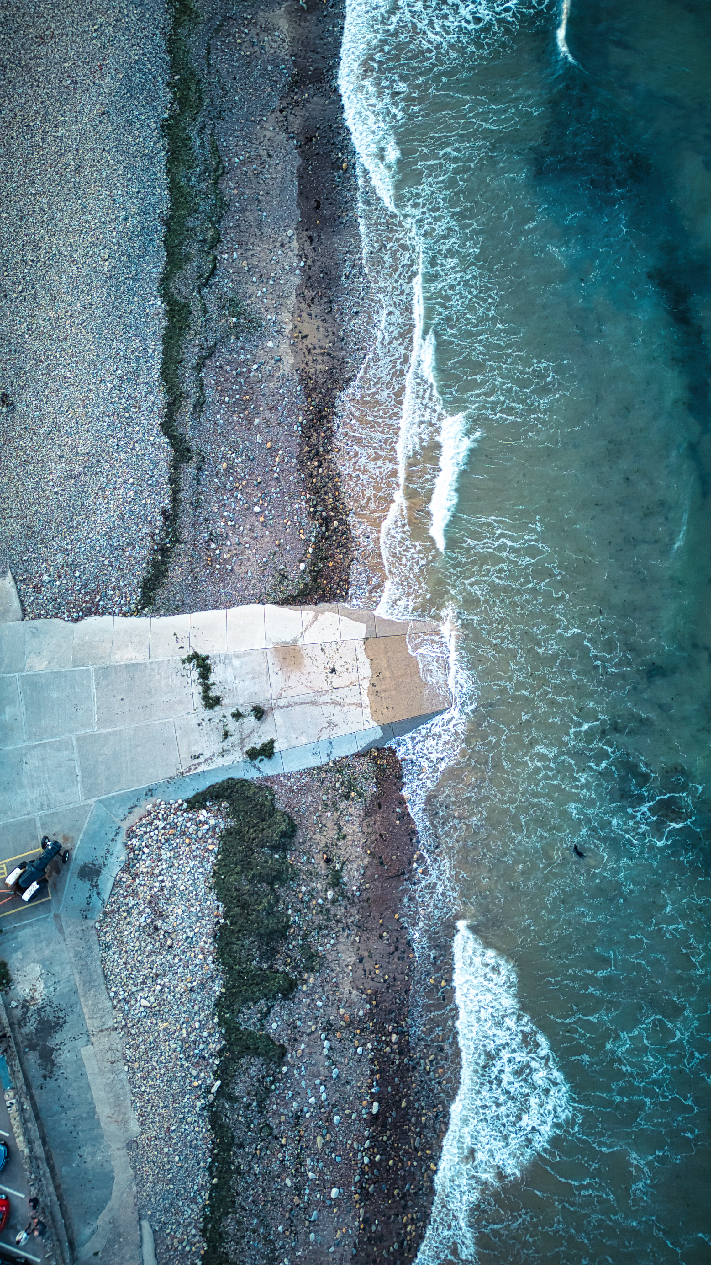 Aerial view of a serene beach with waves gently lapping against a stone pier in Saltburn-by-the-Sea