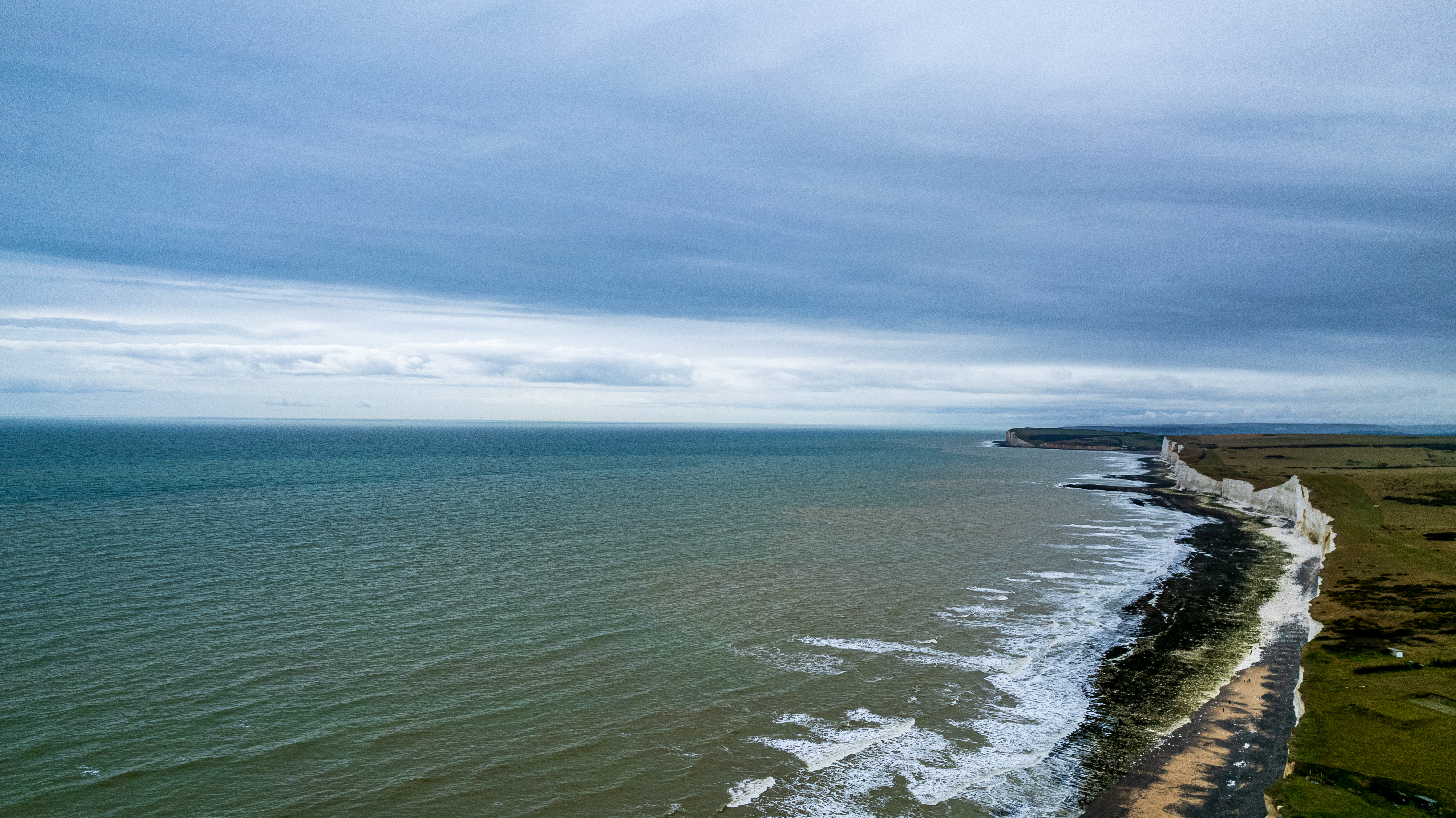 Aerial view of a serene coastline with waves lapping against the shore under a cloudy sky.