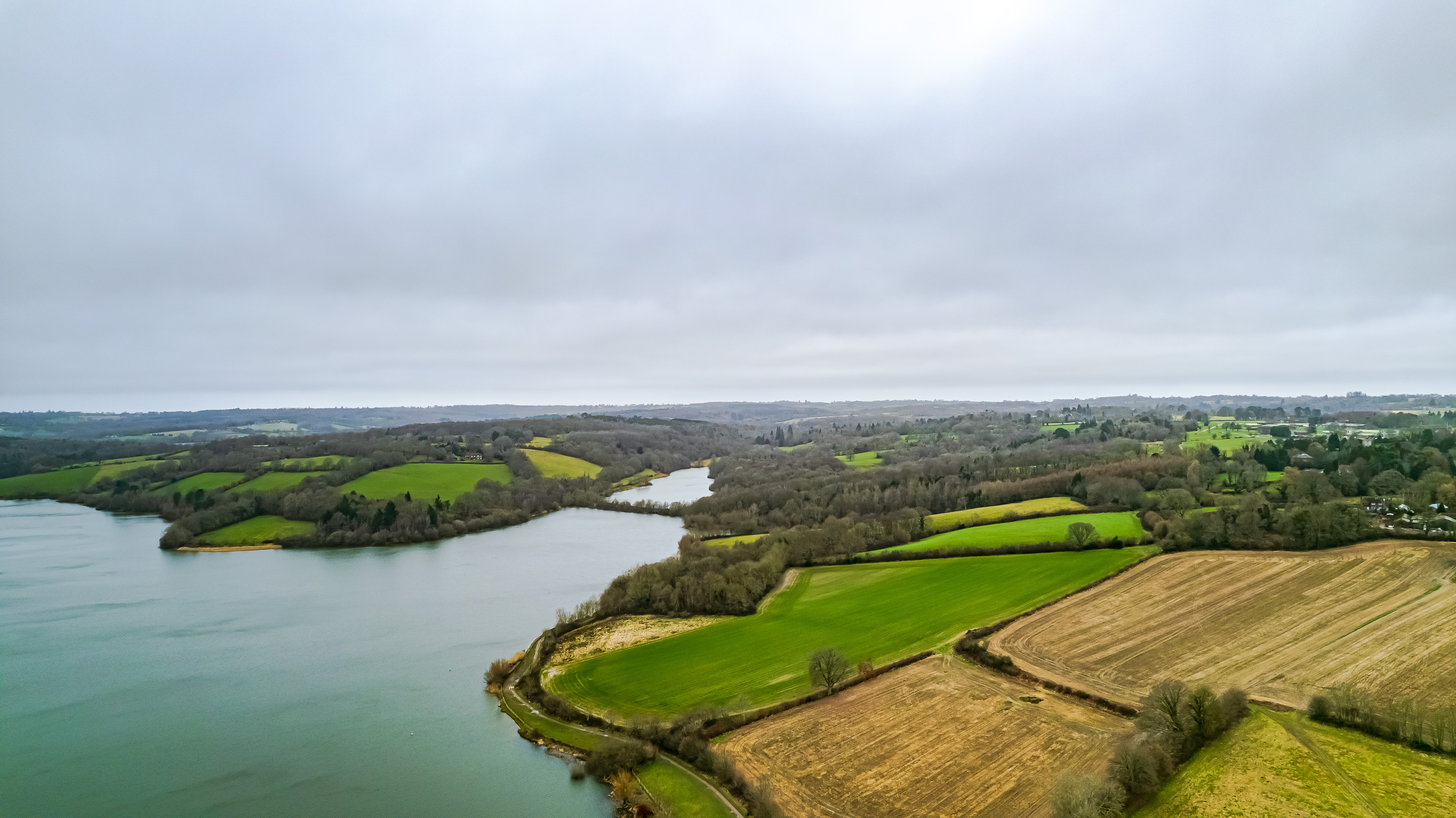 Aerial view of a serene lake with surrounding farmland and patches of greenery under an overcast sky.