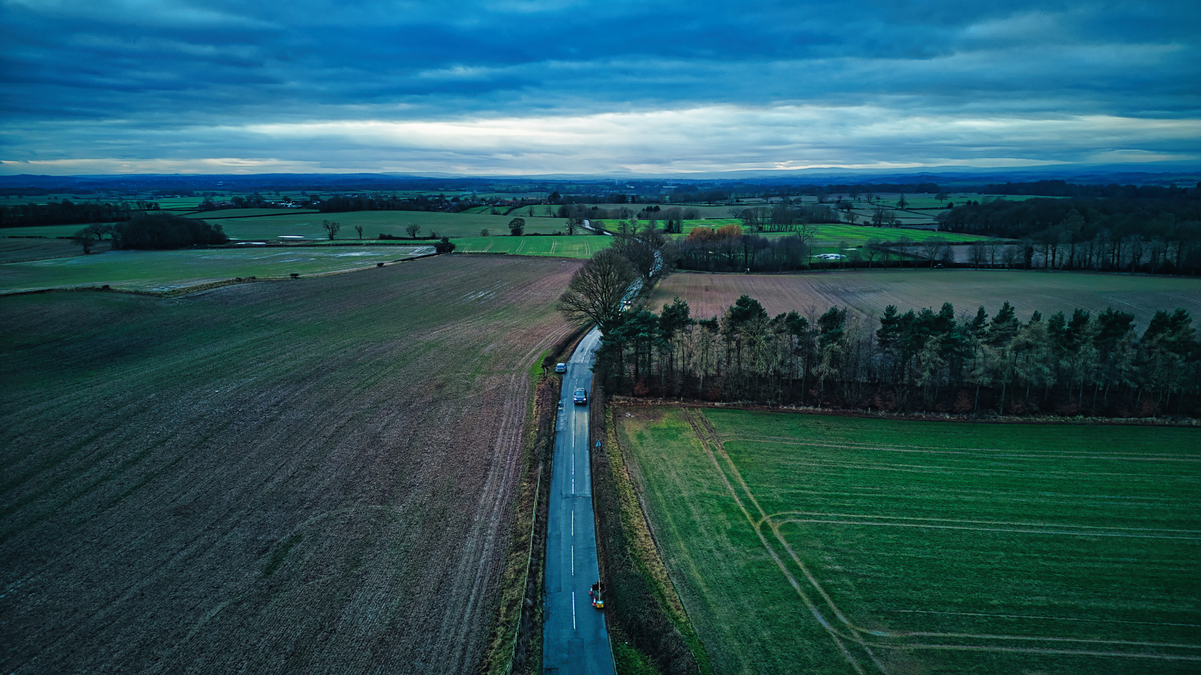 Aerial view of a serene rural landscape with a narrow river cutting through fields and forests under a cloudy sky.
