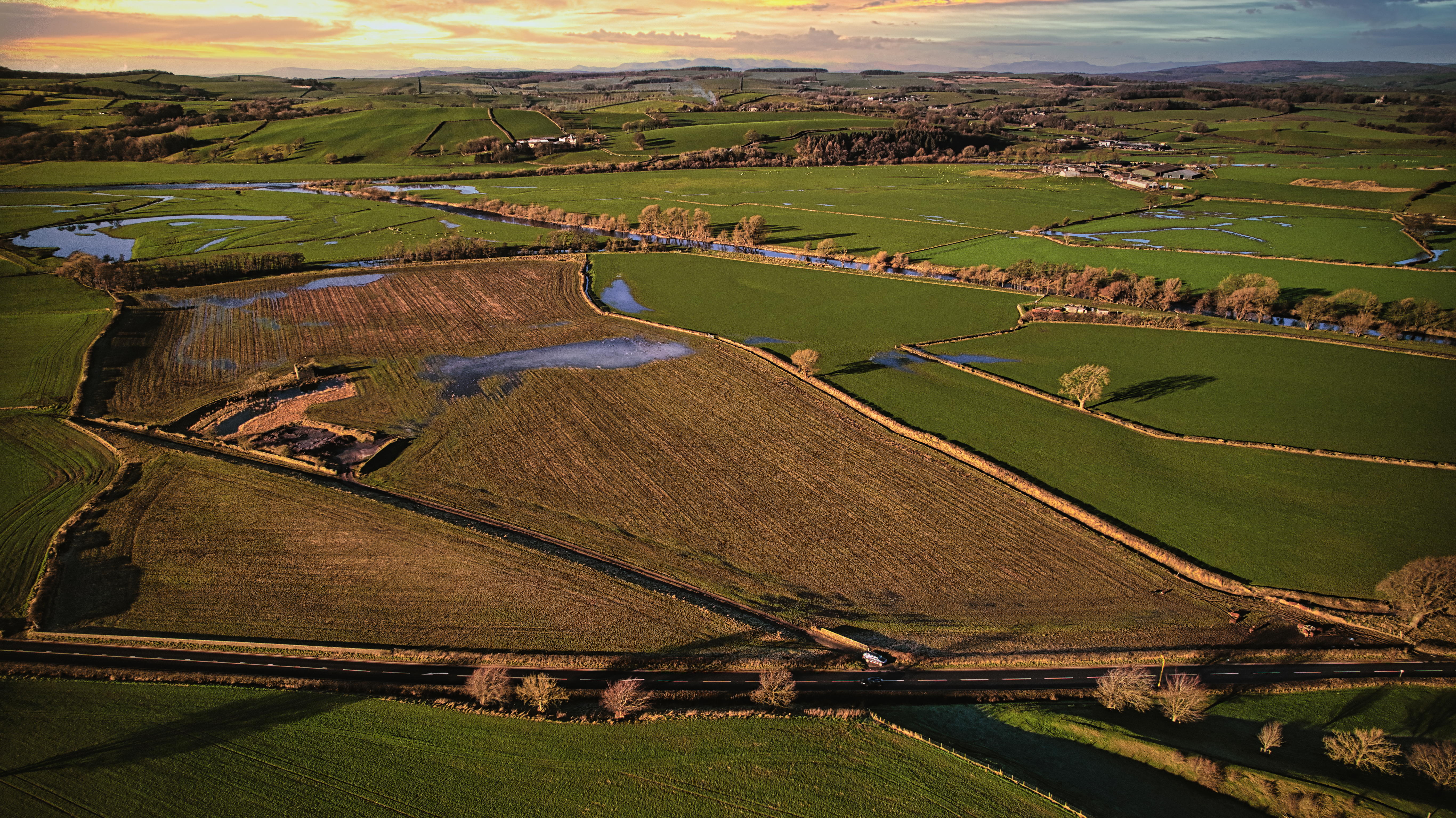 Aerial view of a serene rural landscape with fields, a winding river, and scattered trees during golden hour.