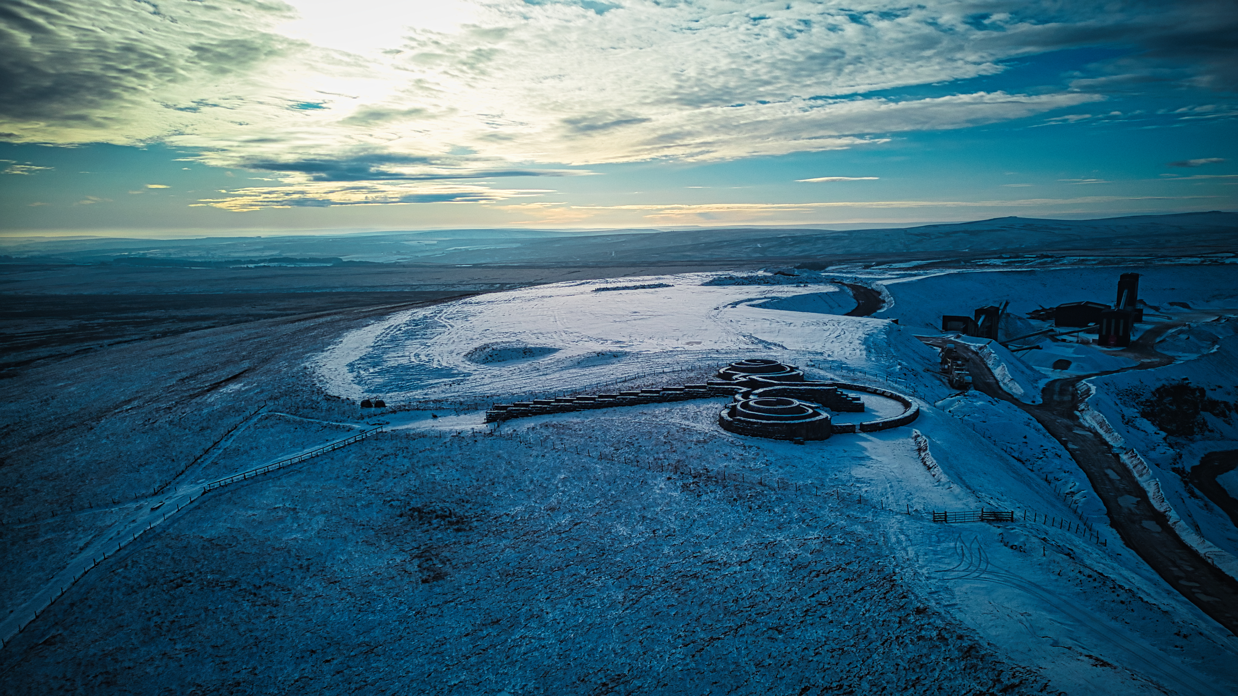 Aerial view of a snowy landscape at dusk with winding roads and sparse buildings.