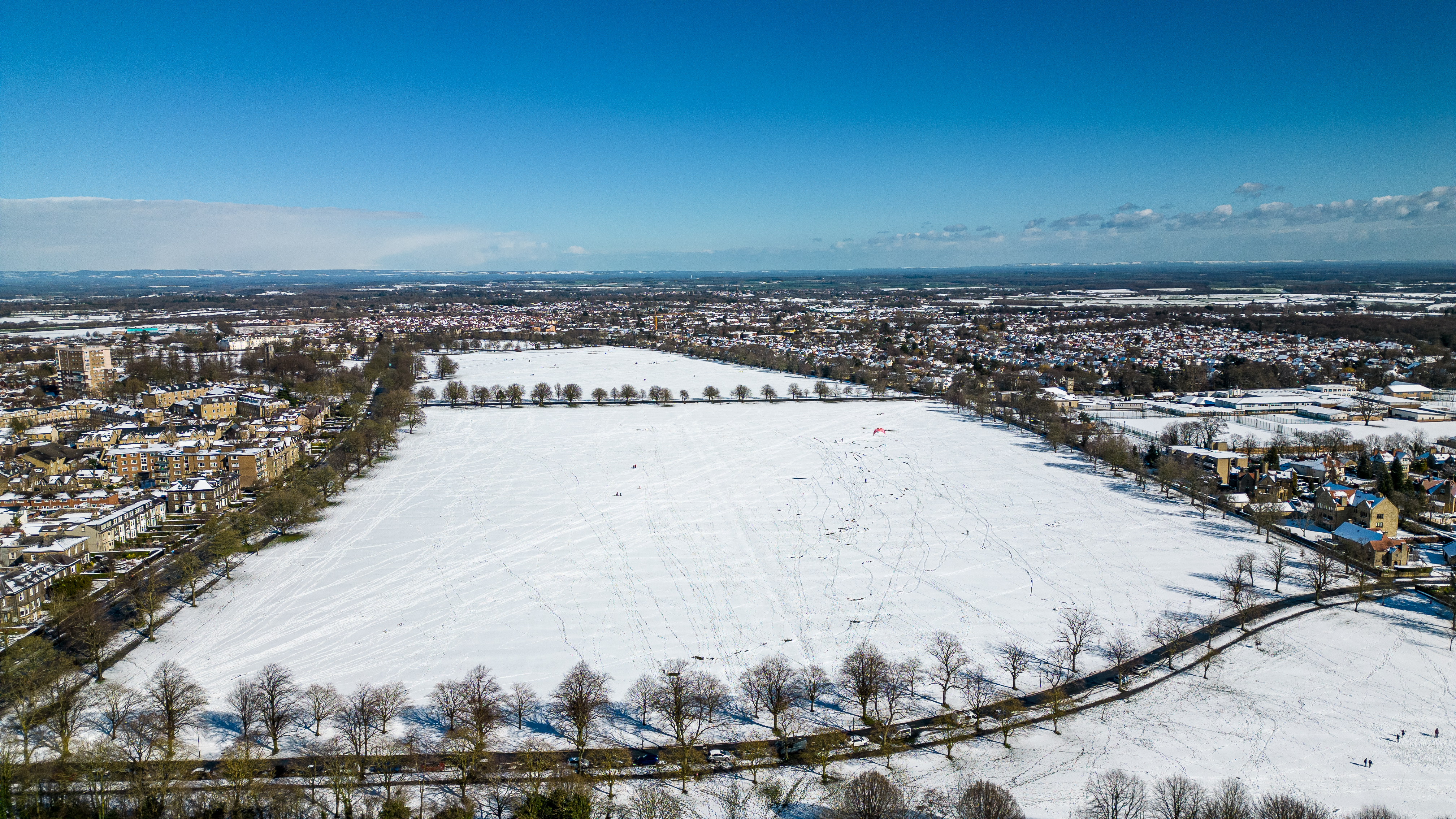 Aerial view of a snowy landscape with a road dividing urban and rural areas under a clear blue sky in Harrogate, North Yorkshire.
