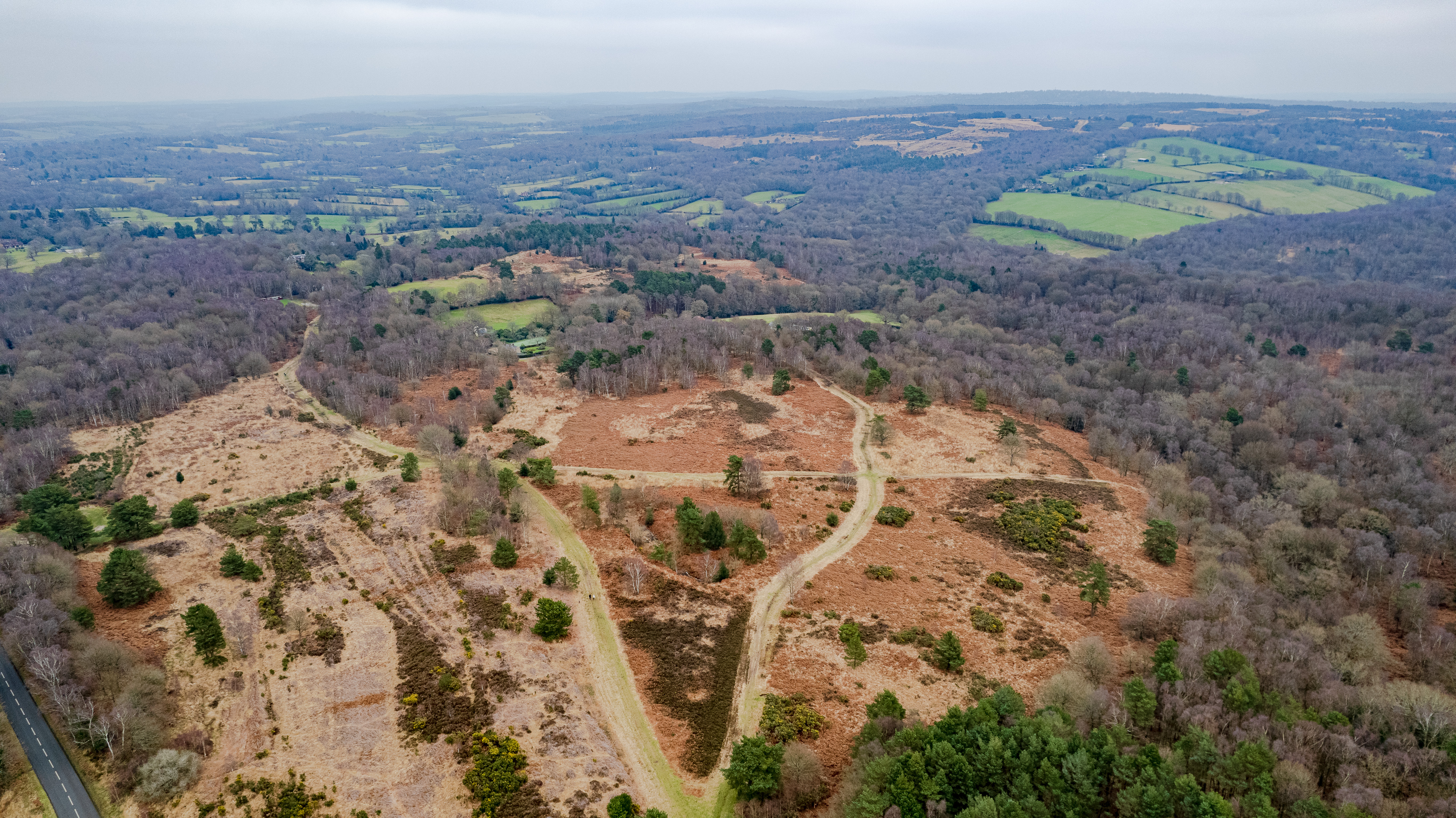 Aerial view of a sprawling landscape with winding roads and patches of forested areas, showcasing a mix of natural terrain and pathways.