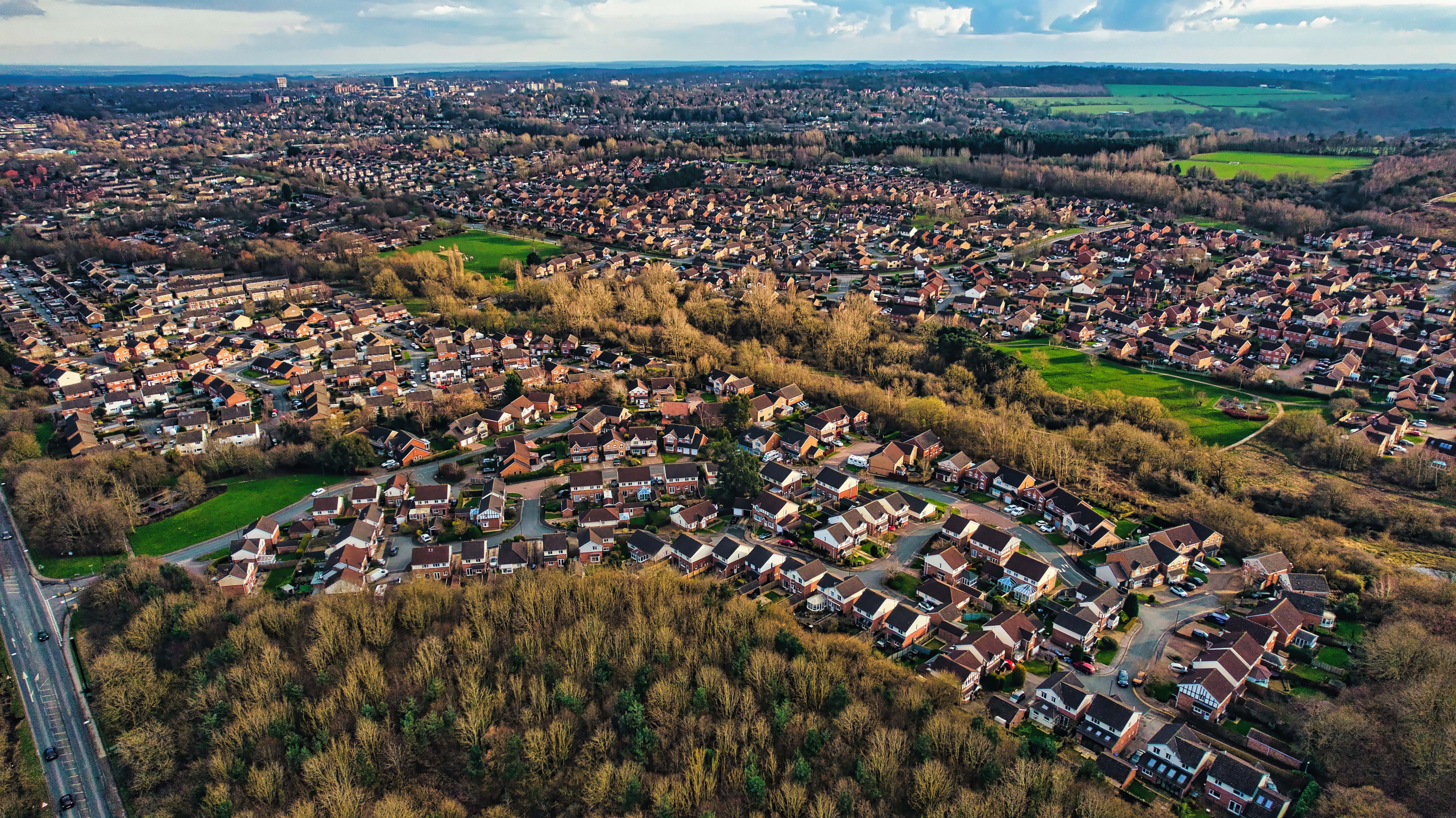 Aerial view of a suburban area with dense housing and green spaces under a cloudy sky in Harrogate, North Yorkshire.
