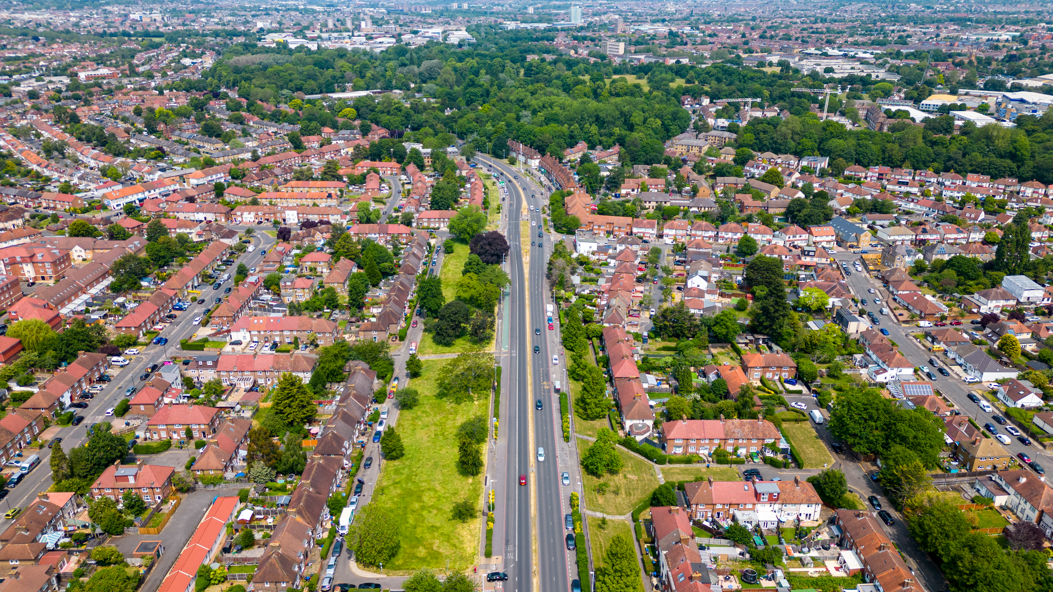 Aerial view of a suburban area with rows of houses and a central road flanked by green spaces in London.