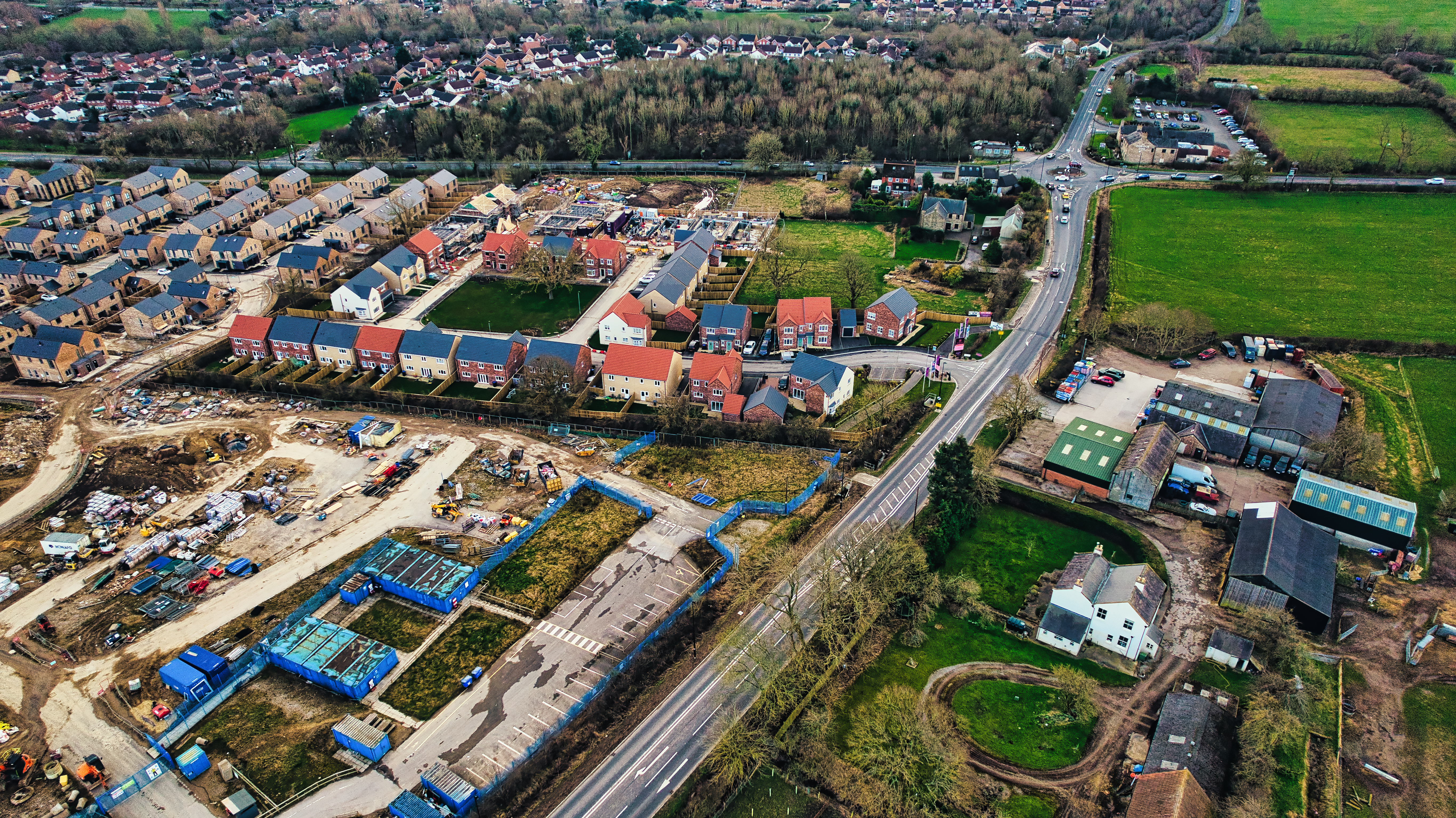 Aerial view of a suburban development with houses, roads, and construction area in Harrogate, North Yorkshire.