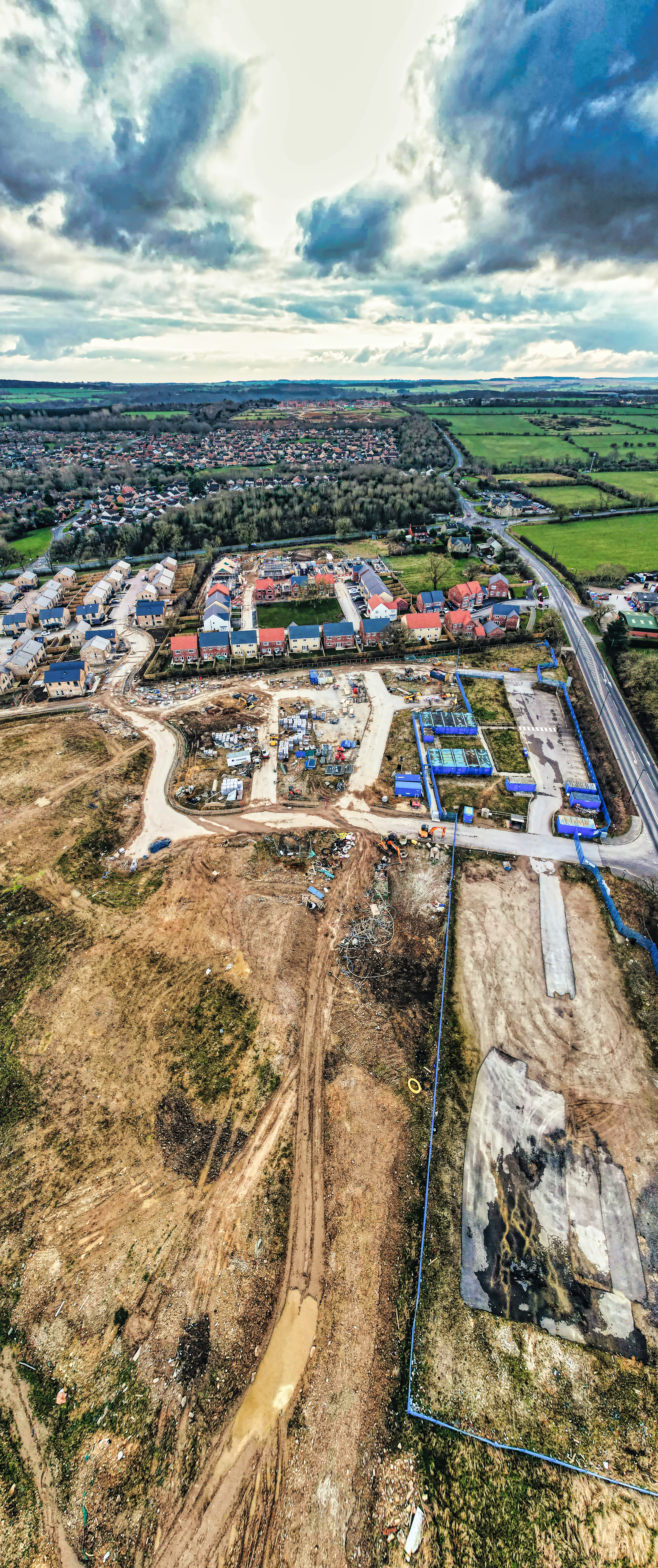 Aerial view of a suburban development with houses, roads, and construction area in Harrogate, North Yorkshire.