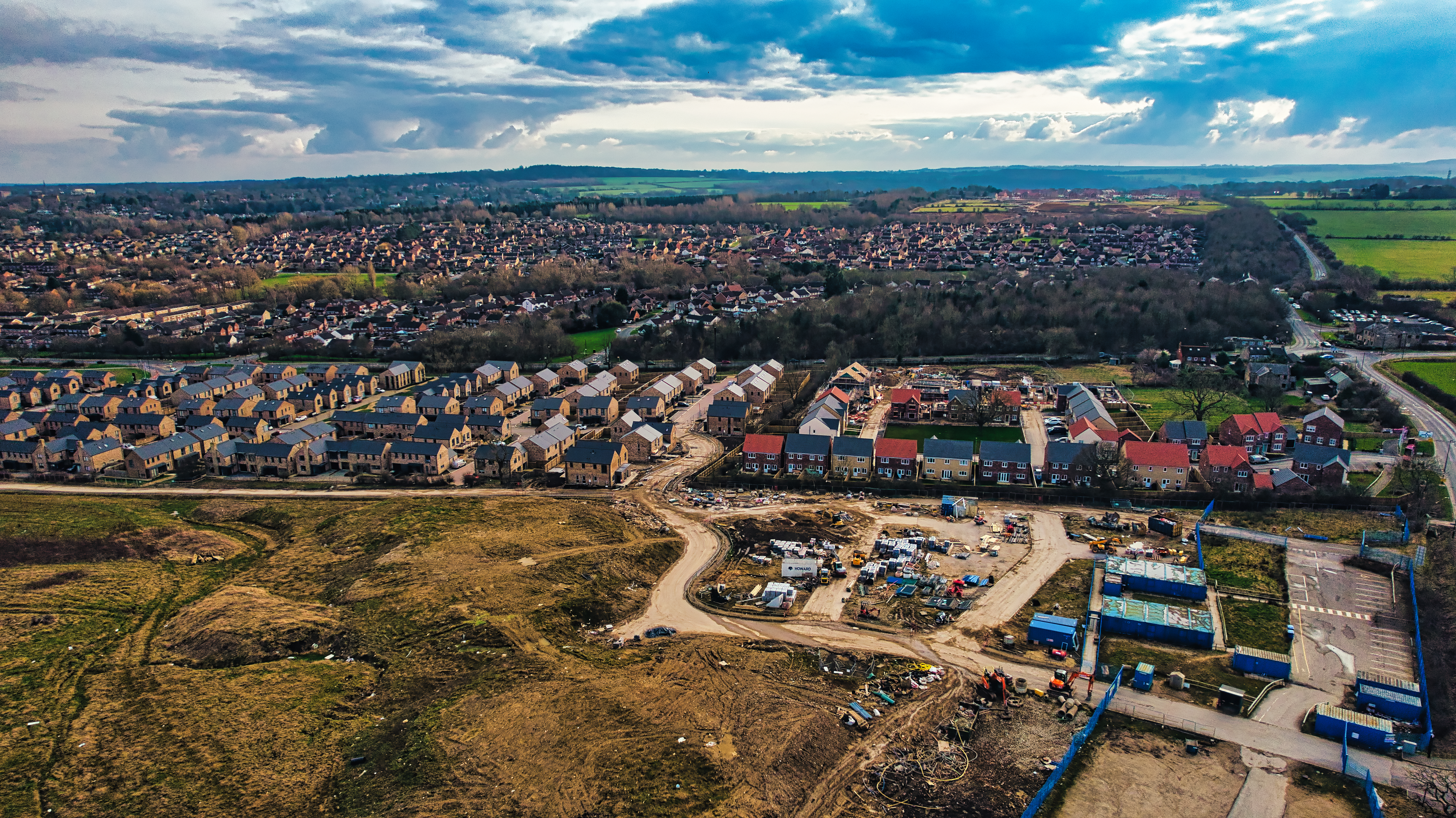 Aerial view of a suburban development with houses and roads, showcasing urban expansion into rural areas in Harrogate, North Yorkshire.