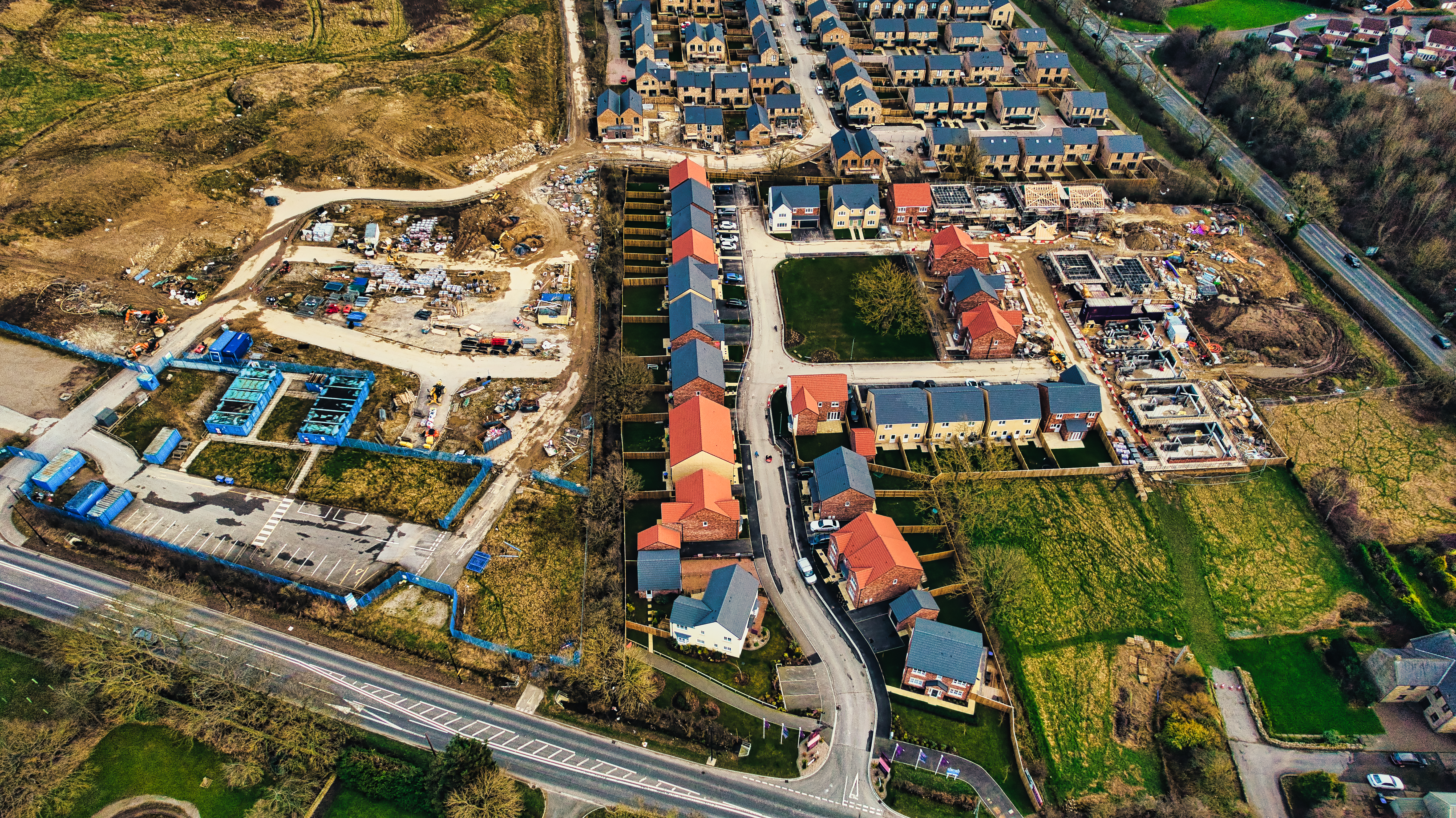 Aerial view of a suburban development with rows of houses, showing construction areas and completed homes with red roofs in Harrogate, North Yorkshire.