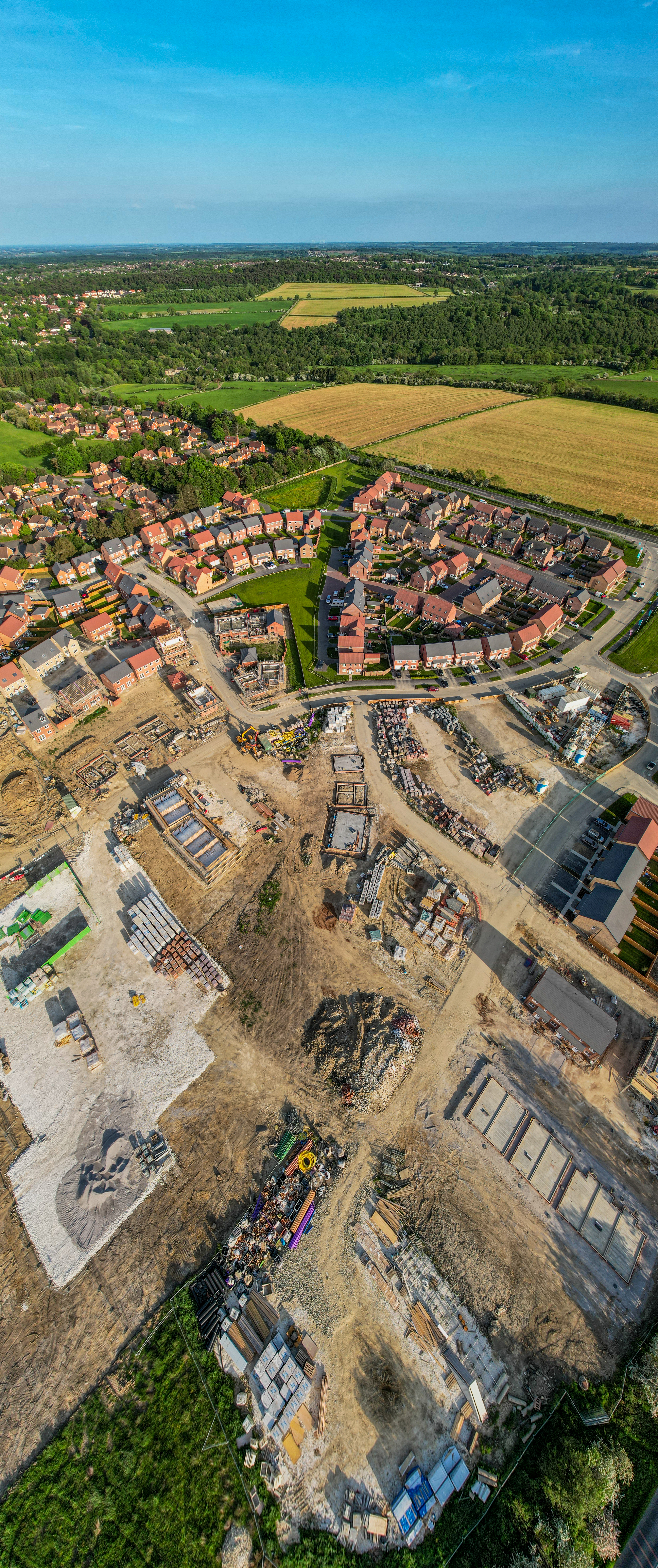 Aerial view of a suburban housing development under construction, with completed homes nearby and open fields in the distance.