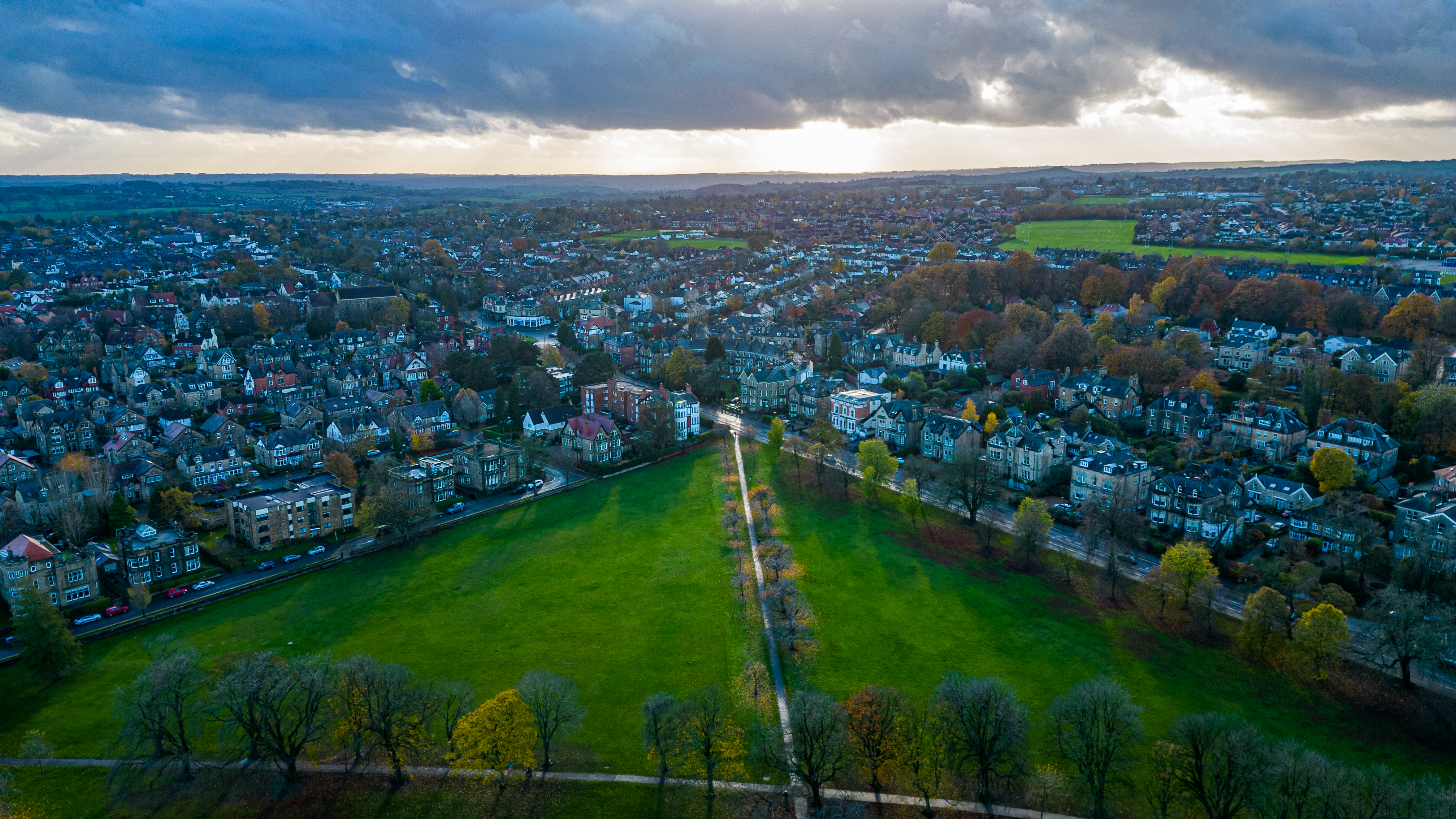 Aerial view of a suburban landscape at sunset with sun rays piercing through clouds, highlighting green spaces and residential areas in Harrogate, North Yorkshire.