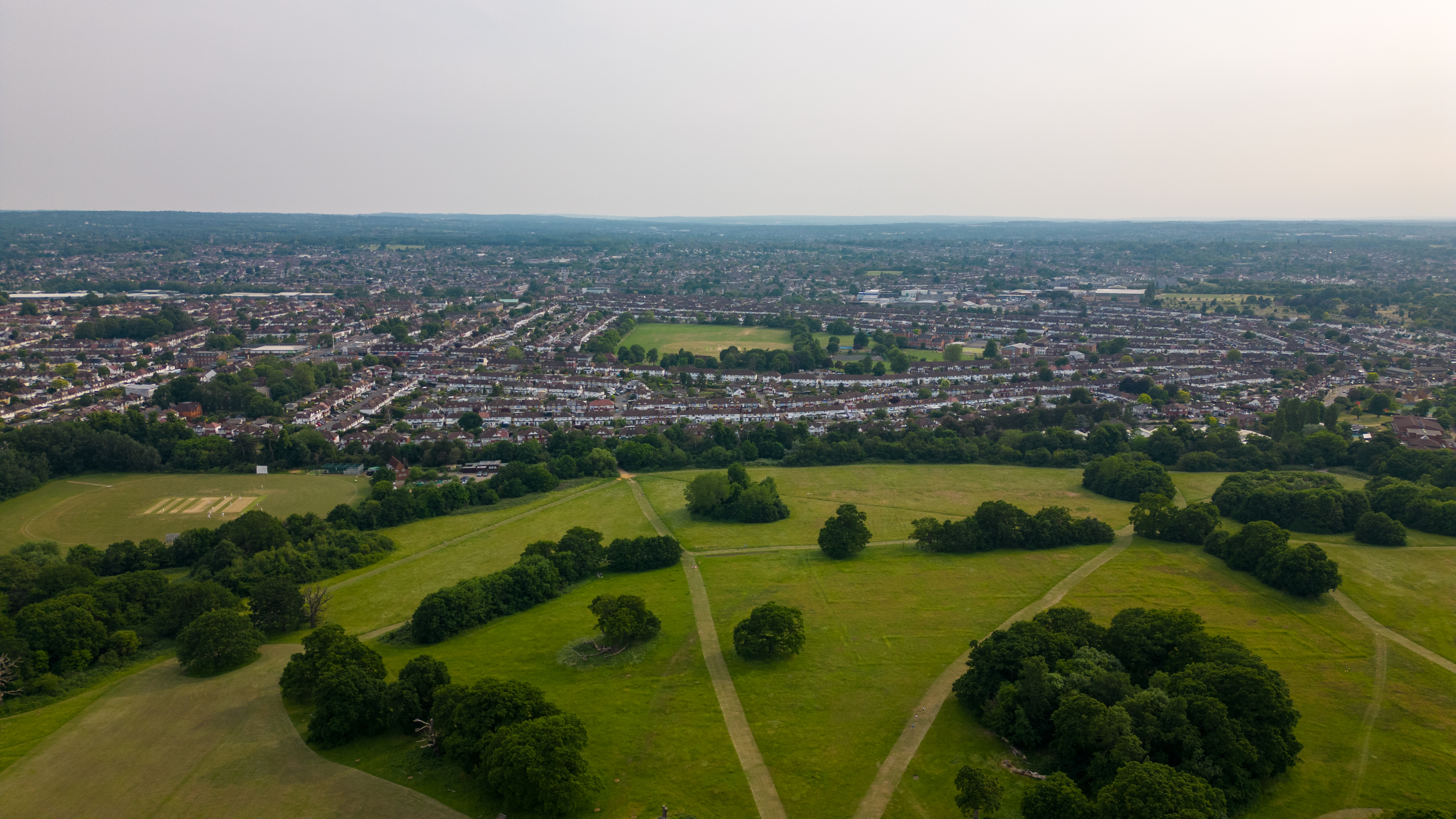 Aerial view of a suburban landscape with green parks and residential areas under a hazy sky in London.