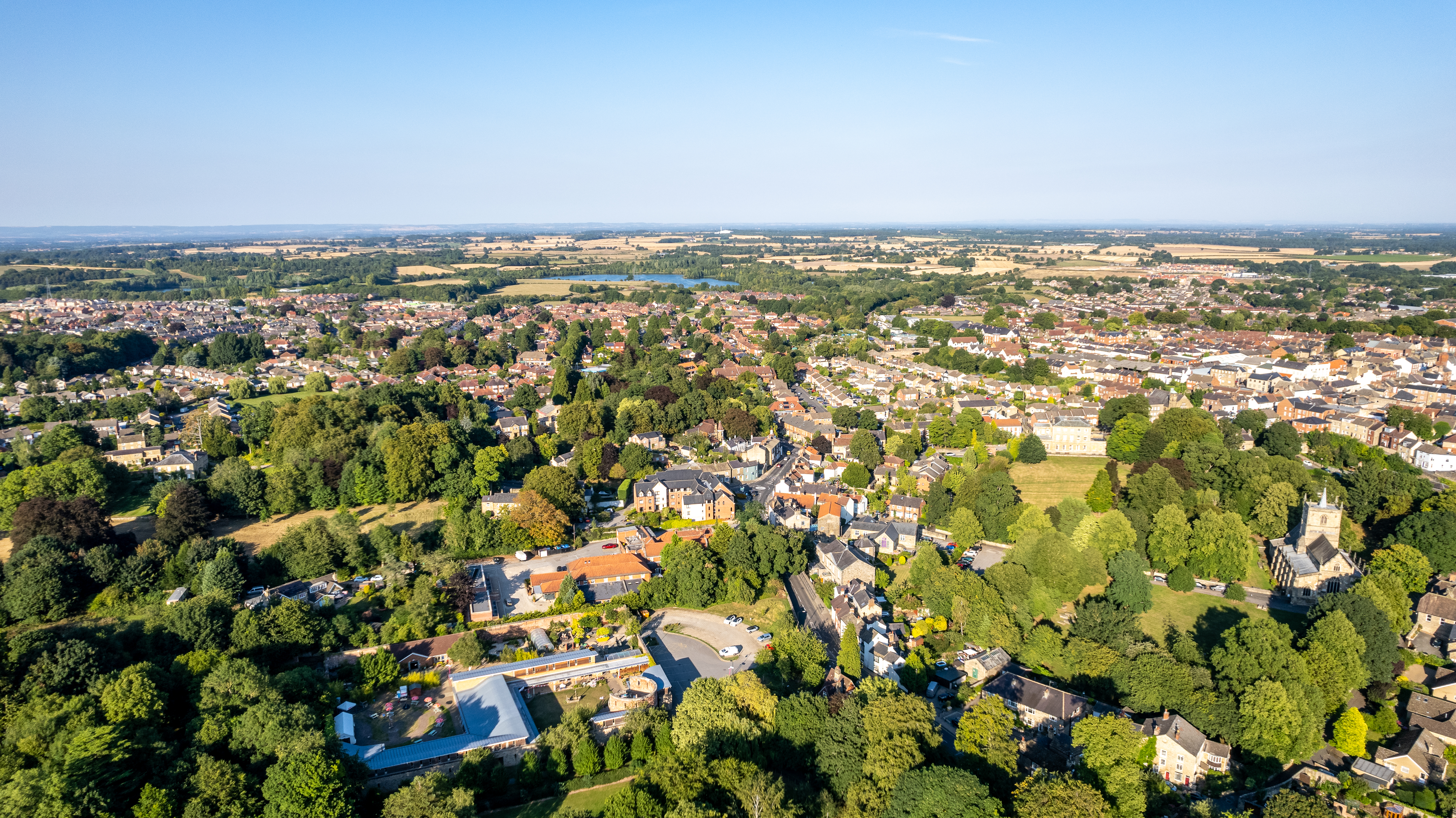 Aerial view of a suburban landscape with residential houses and greenery under a clear blue sky in Knaresborough, North Yorkshire.