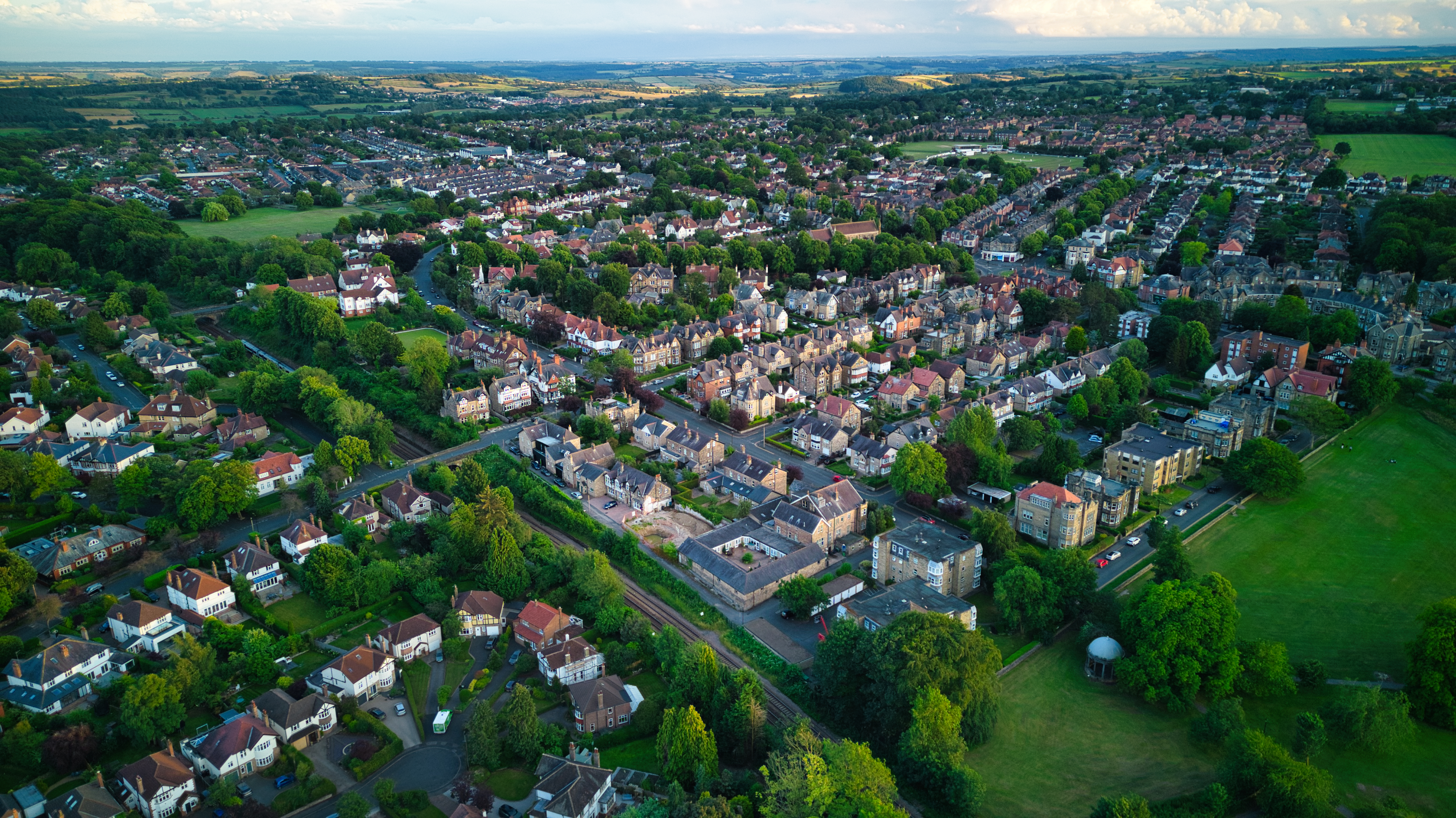 Aerial view of a suburban neighborhood at dusk with lush greenery and rows of houses in Harrogate, North Yorkshire.
