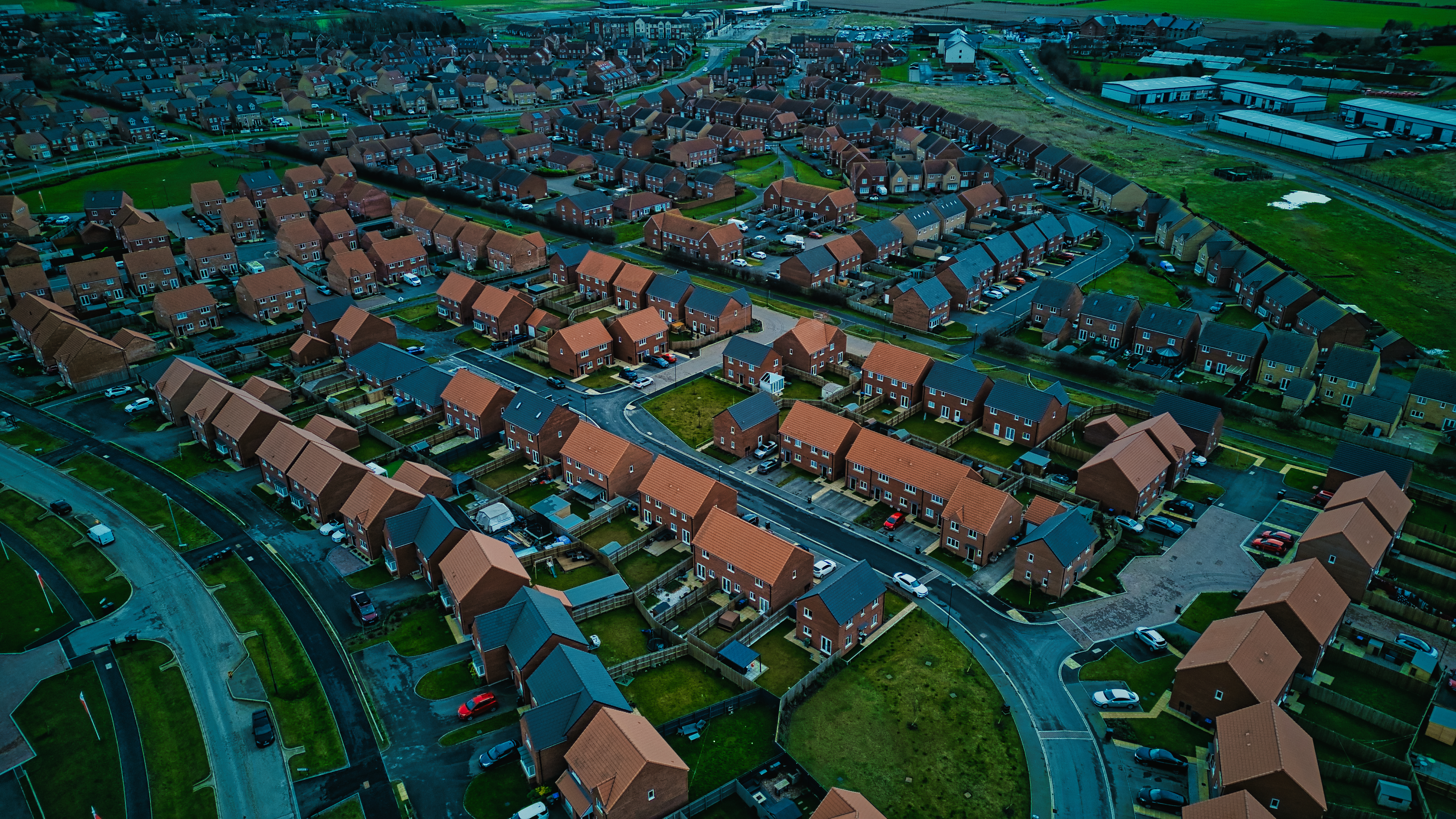 Aerial view of a suburban neighborhood at dusk with rows of houses and green spaces.