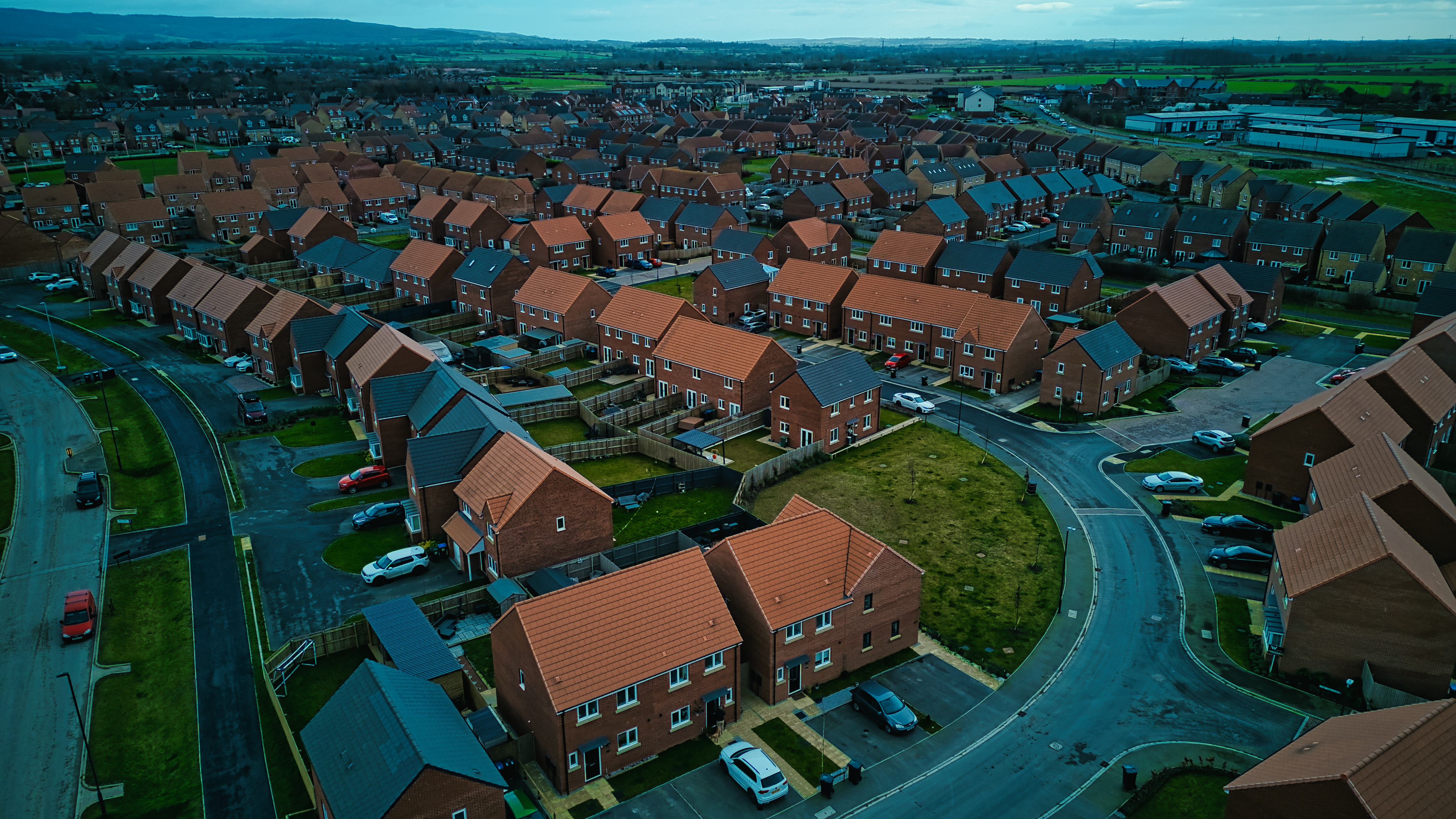 Aerial view of a suburban neighborhood at dusk with rows of houses and streets.