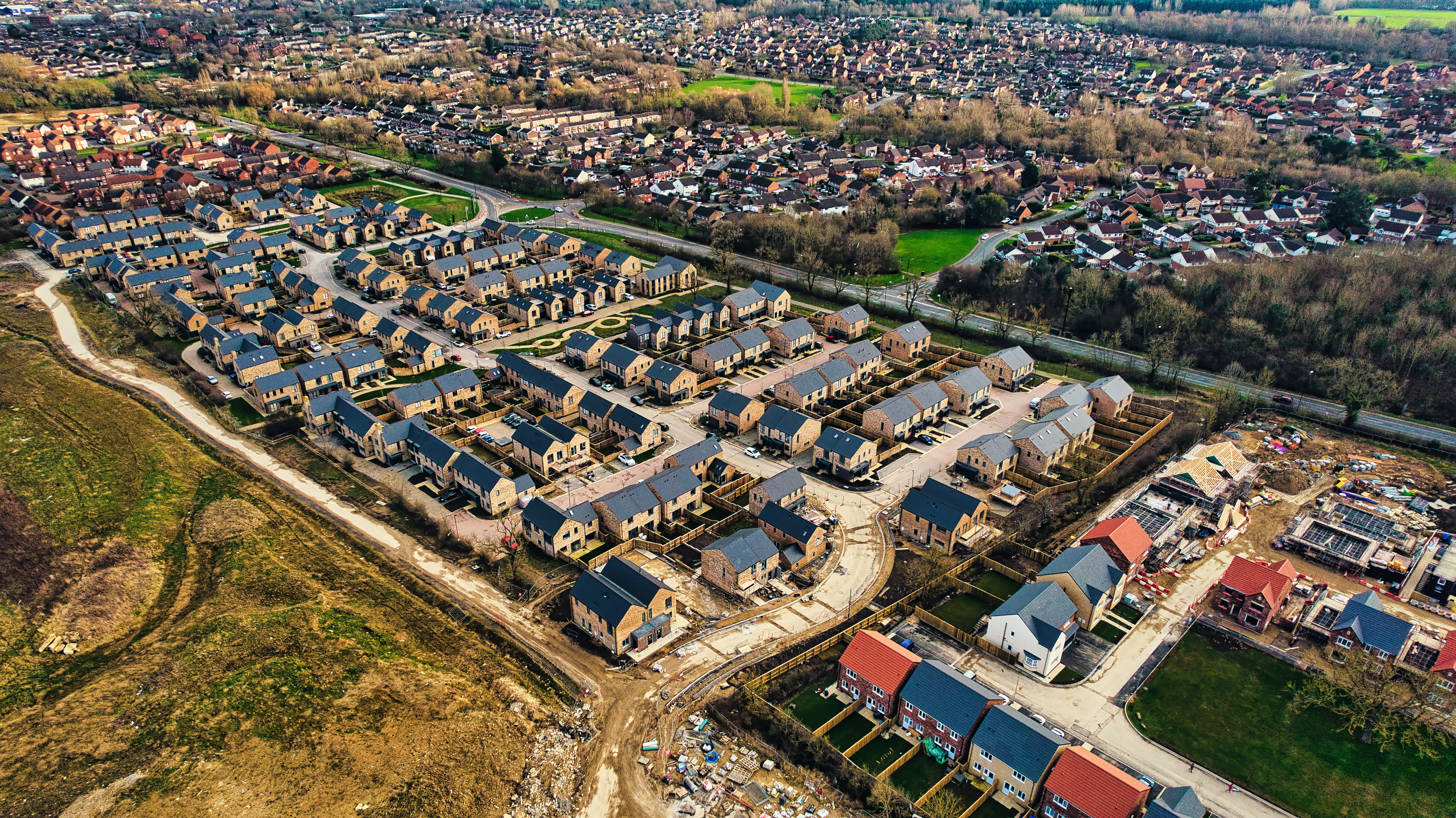Aerial view of a suburban neighborhood with rows of houses, showing development and urban planning in Harrogate, North Yorkshire.